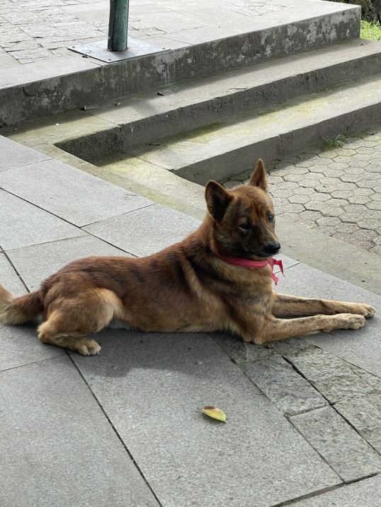 A dog laying around in the temple and he looks like he well taken care of.