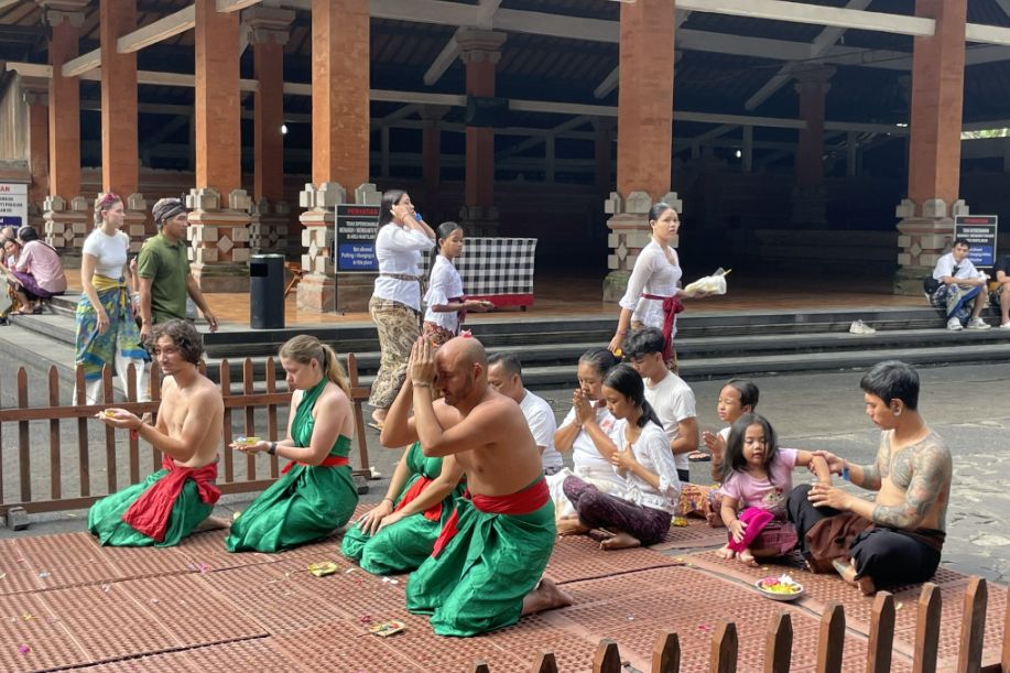 The four Western visitors dressed in green sarongs (men) and green temple dresses (women) were likely participating in a guided prayer ceremony. Many visitors choose to go beyond just watching the temple and actually take part in the ritual blessings and purification.