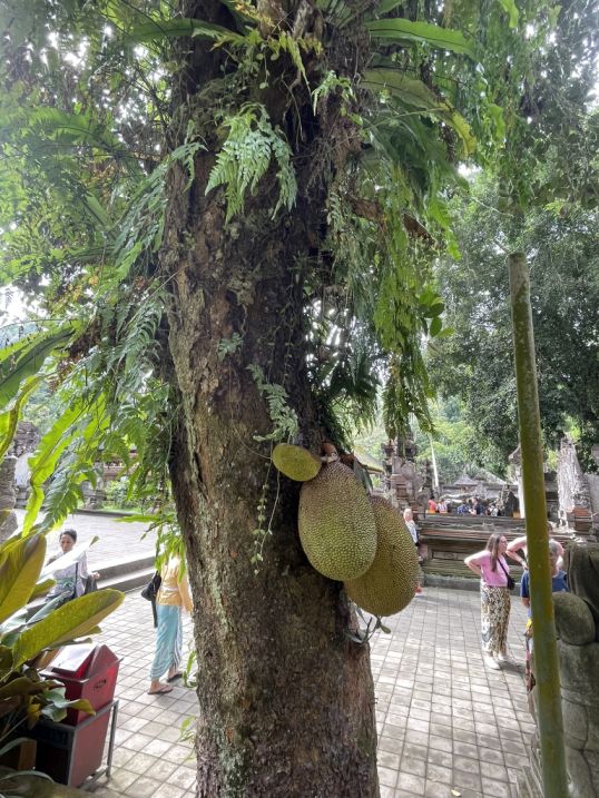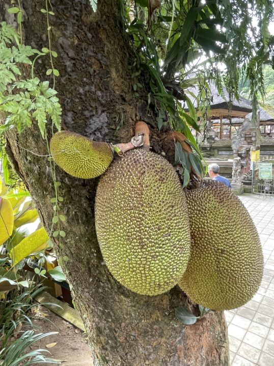 A Jackfruit tree with large spiky fruits do not hang from branches like apples or mangoes, but instead grow directly out of the trunk and larger limbs. Seeing the two large and one smaller fruit is a lovely example of this tropical growth pattern!