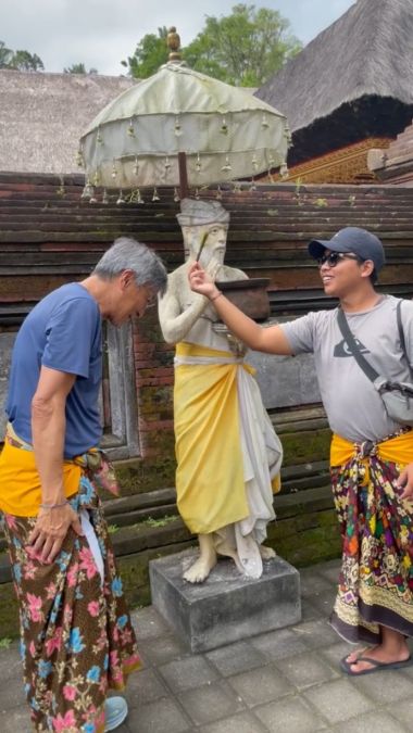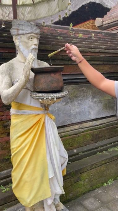 Our tour guide giving Hoa's blessing with the holy water directly from the sacred spring or the purification pool itself. The statue of the man holding a pot (or vessel) of holy water is a representation of a deity or a spiritual figure associated with the spring's sacred power, often protecting or symbolizing the source of the holy water. Receiving the blessing is the final, essential step after the purification ritual. The water is usually sprinkled over the head and often pressed onto the forehead and behind the ears, symbolizing a spiritual cleansing and receiving good fortune for your onward journey.