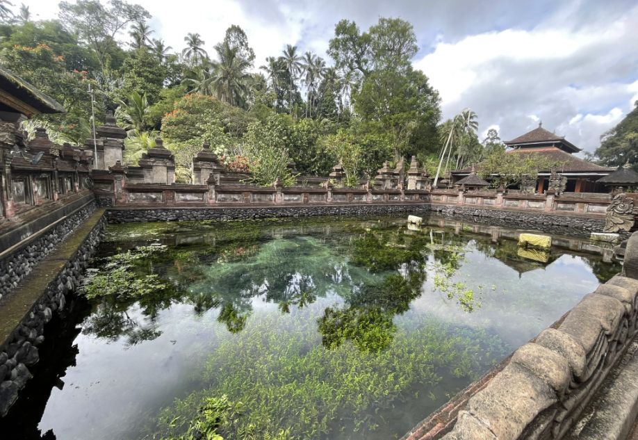 The pond with extremely clear water and plants growing underneath is the sacred spring pond, also called the “Jernih Spring” or “Petirtaan Spring”. This pond is the spiritual heart of Tirta Empul, the place where the holy water begins its journey before flowing to millions of worshippers across Bali.