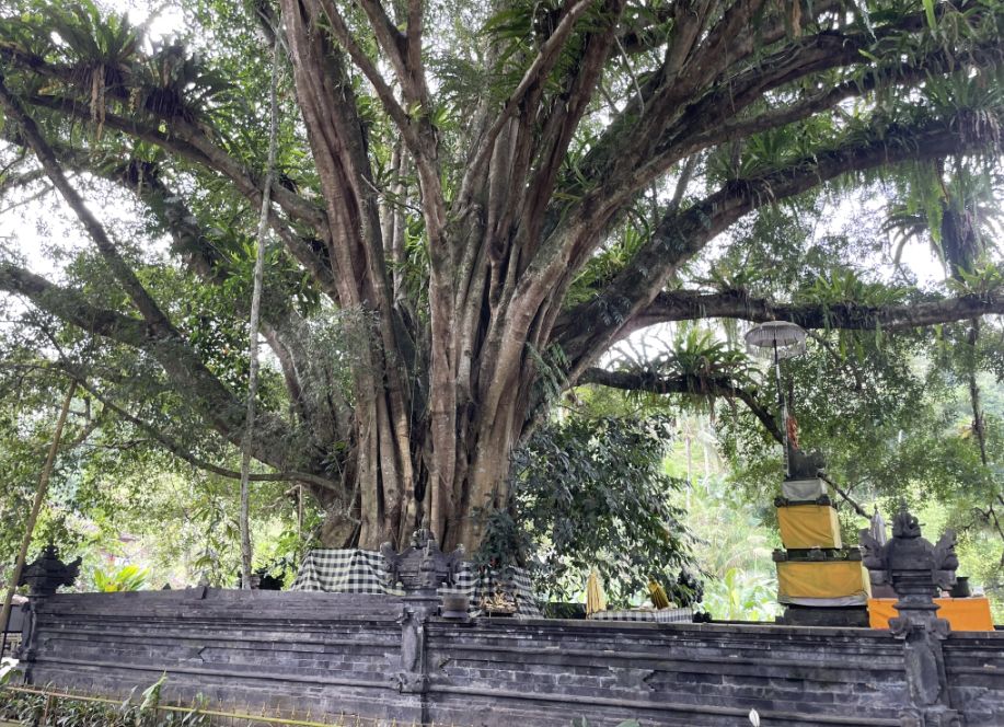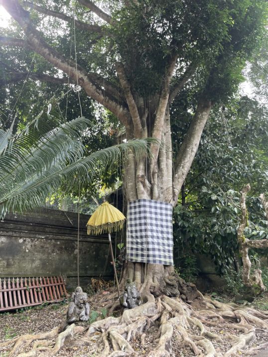 A large tree wrapped in wrapped in black-and-white checkered sarongs, which symbolize Duality and balance (good/evil, light/dark) and Protection, the guardians watch over the area and ward off negative energy.