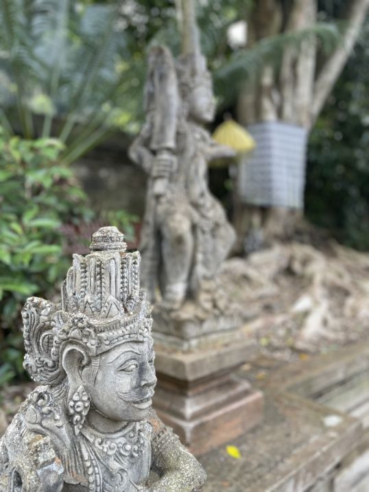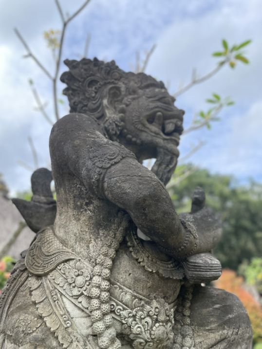 Balinese Guardian Figure or a Mythological Scene meant to protect the village. These statues forms are strategically placed at entrances to intimidate and ward off actual evil spirits from entering the sacred space. They symbolize the raw power necessary to protect the purity of the village.
