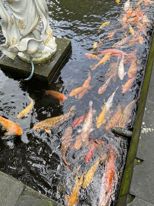 This area, with the vibrant fish and peaceful fountains, serves as a beautiful, tranquil garden space for quiet reflection before you leave the main temple grounds.