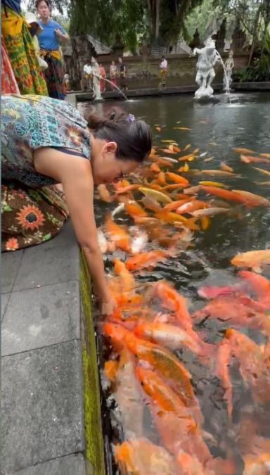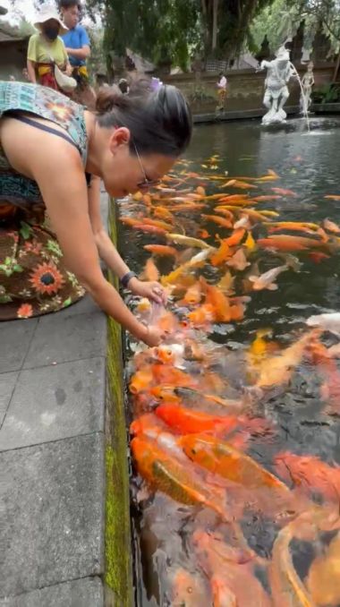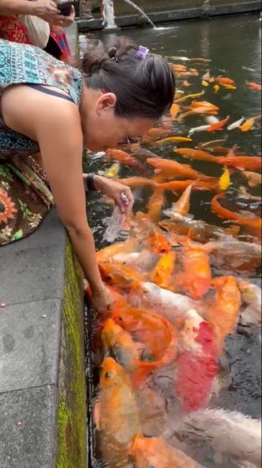 It's a beautiful moment of interaction with nature and reflects the overall peaceful environment of the sacred temple.