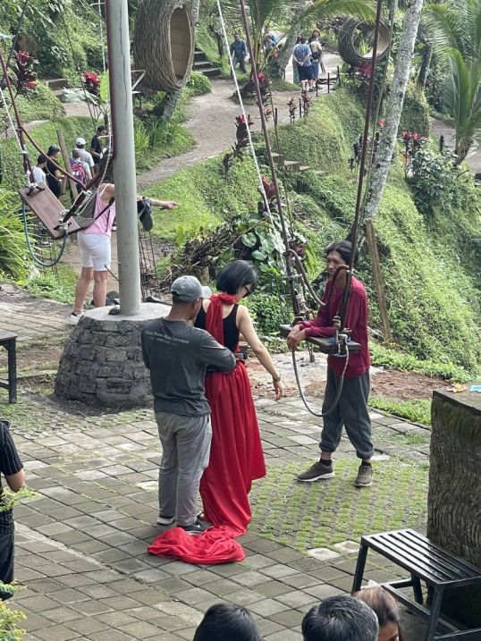 As we stepped into Tegalalang, that sense of commercial energy became obvious almost immediately. Within just a few minutes of walking in, we saw two ladies dressed in bright red and fuchsia soaring through the air on one of the famous “Bali swings.” Their vibrant outfits and the dramatic swinging motion against the backdrop of golden rice terraces made quite a striking scene, but it also highlighted how much this area has transformed into a spot built for photos, souvenirs, and quick thrills.