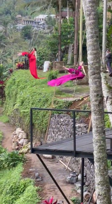 Many of the visitors wore flowing red dresses that billowed dramatically in the air, adding to the spectacle. The bright red fabric stood out sharply against the greens and gold of the terraces, creating those classic “Bali swing” photos everyone recognizes.