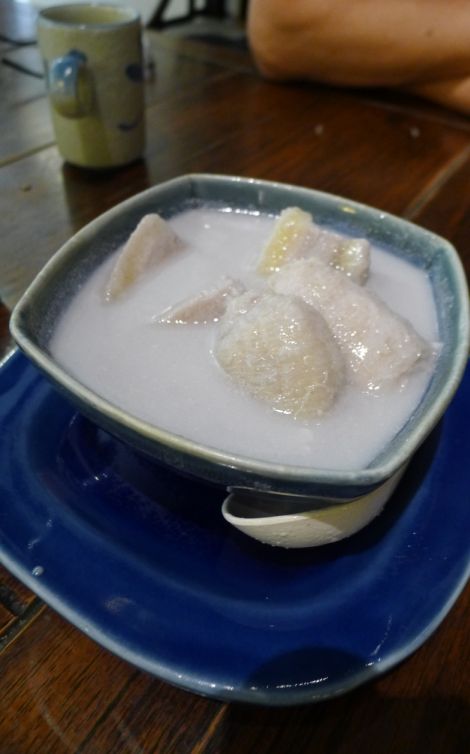 kluai buat chi is a Thai banana dessert made with bananas cooked in coconut milk and topped with coconut cream. The bananas are the kluai nam wa variety and the word kluai means banana. |