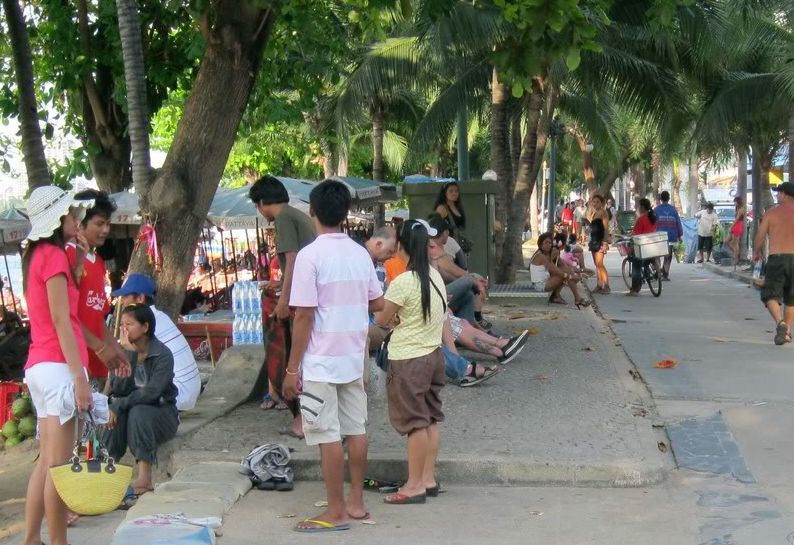 The street lining the beach is full of people and lots of prostitute standing around.