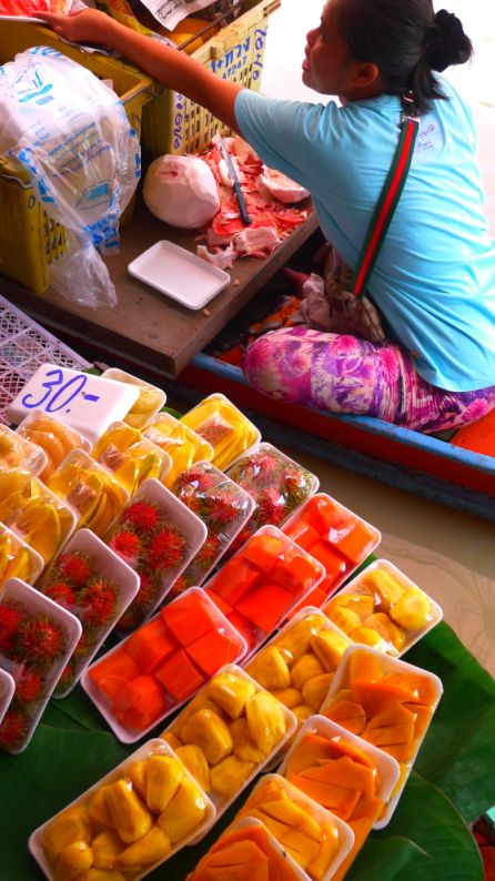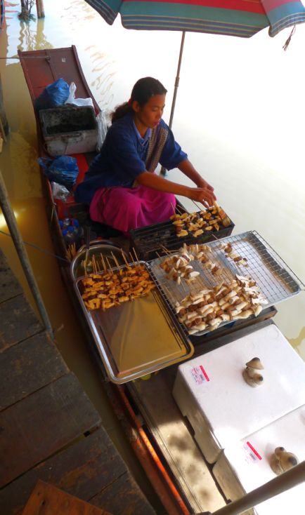 After buying your food from small boat people can sit down and eat their food sitting down on straw mat.