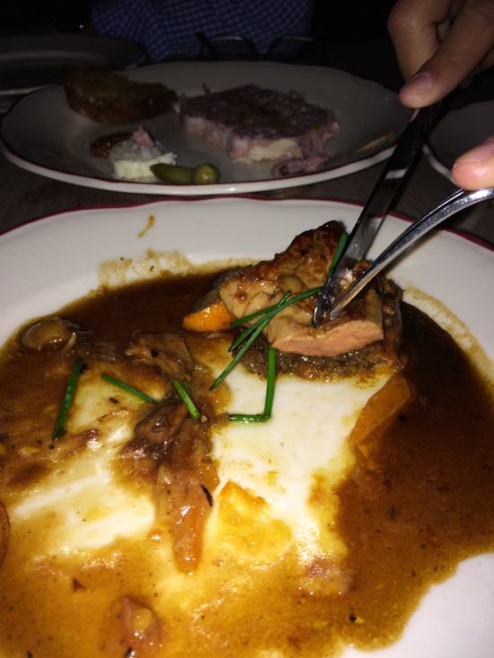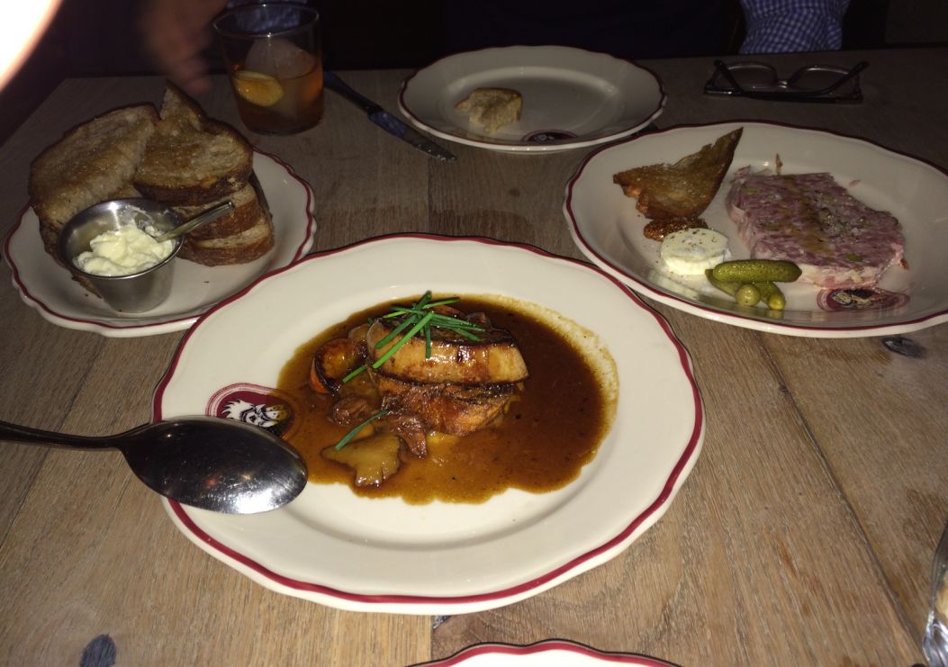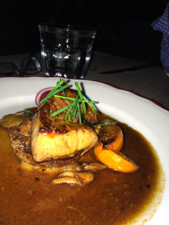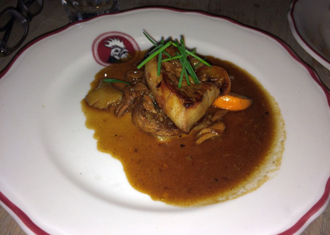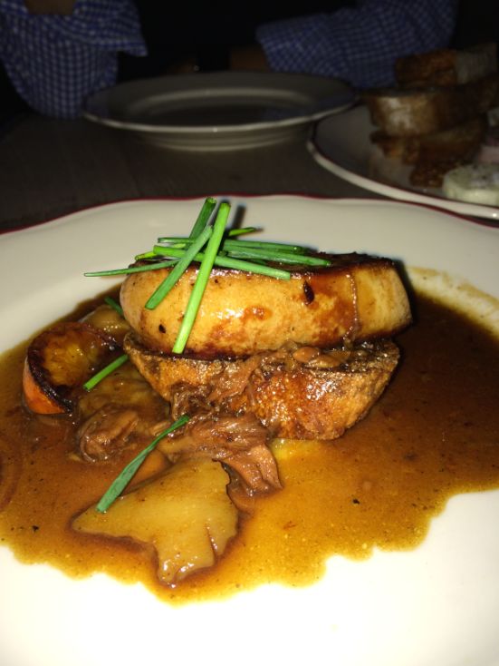 Pan seared foie gras (3oz) on a toasted sour dough bread, braised pig trotter, caramelized mandarin, and orange marmalade.