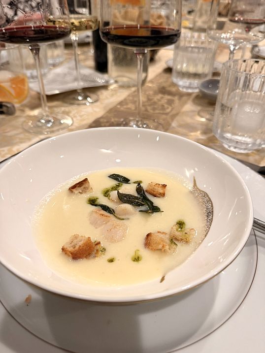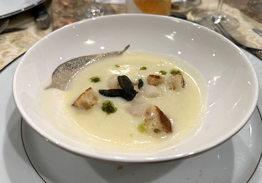 Course 3-Cauliflower Soup with Pan-Seared Scallops, Crouton, Fried Sage Leaf, and Herb Butter