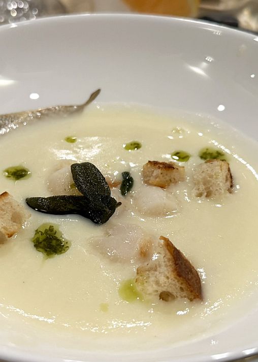 This course is a comforting yet sophisticated bowl of velvety smooth cauliflower soup, made with the finest fresh ingredients, providing a luxurious base. Nestled on top are perfectly pan-seared scallops, their sweet and tender flesh offering a beautiful contrast to the soup's creamy texture. Each bowl is finished with croutons for a hint of crunch, a fragrant fried and crispy sage leaf, and a drizzle of aromatic herb butter, elevating this dish to a wonderful and satisfying dish.