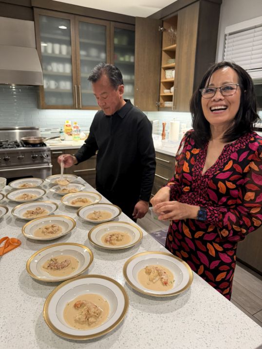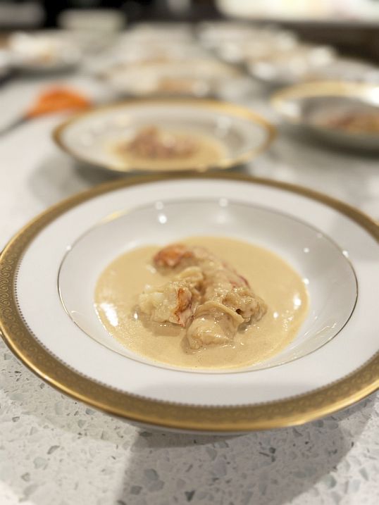 We are now in the kitchen platting the lobster tail in Lobster Broth that Tuan made.