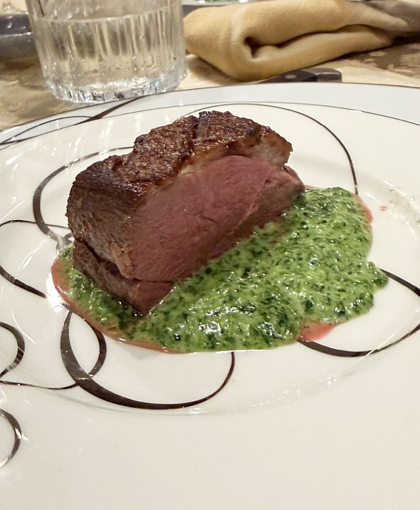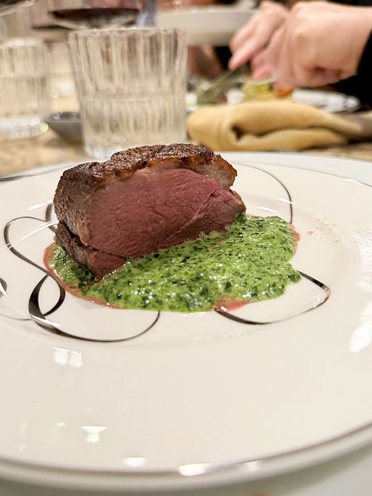 The main course features a magnificent pan-seared Moulard duck breast, cooked to tender perfection with a beautifully rendered, crispy skin. It’s served atop a creamy and vibrant spinach fondue, adding a touch of richness and color. Alongside, a medley of perfectly roasted seasonal vegetables provides earthy flavors and varying textures, creating a hearty and satisfying culmination to our savory courses.