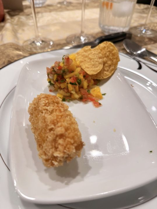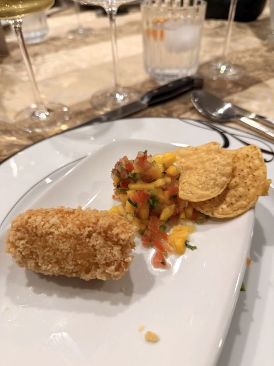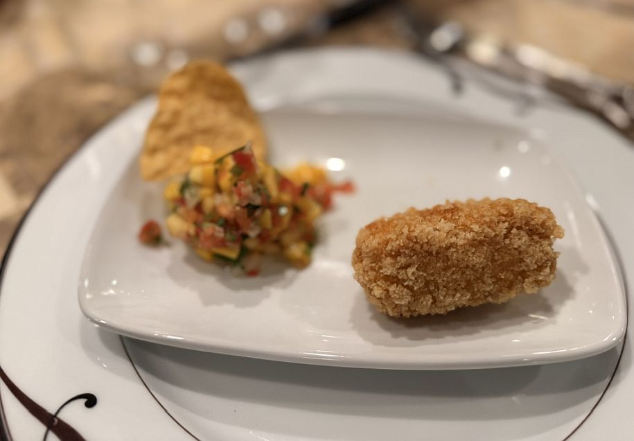 Course 1-Mango Salsa with a crispy mushroom croquette.