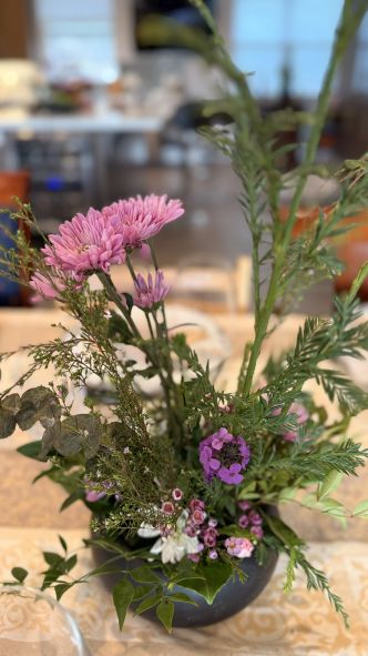 Adding a vibrant touch to the sophisticated setting are the charming floral arrangements. Placed strategically along the table, these bouquets burst with a delightful mix of purple, pink, and yellow blossoms, along with fresh greenery.
