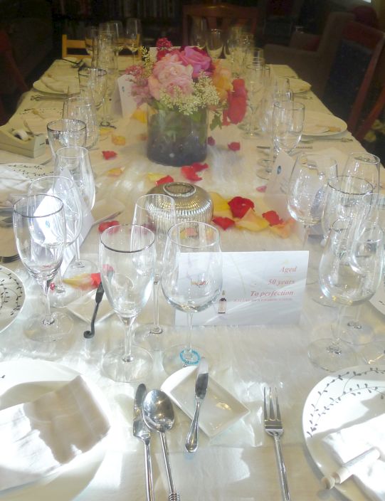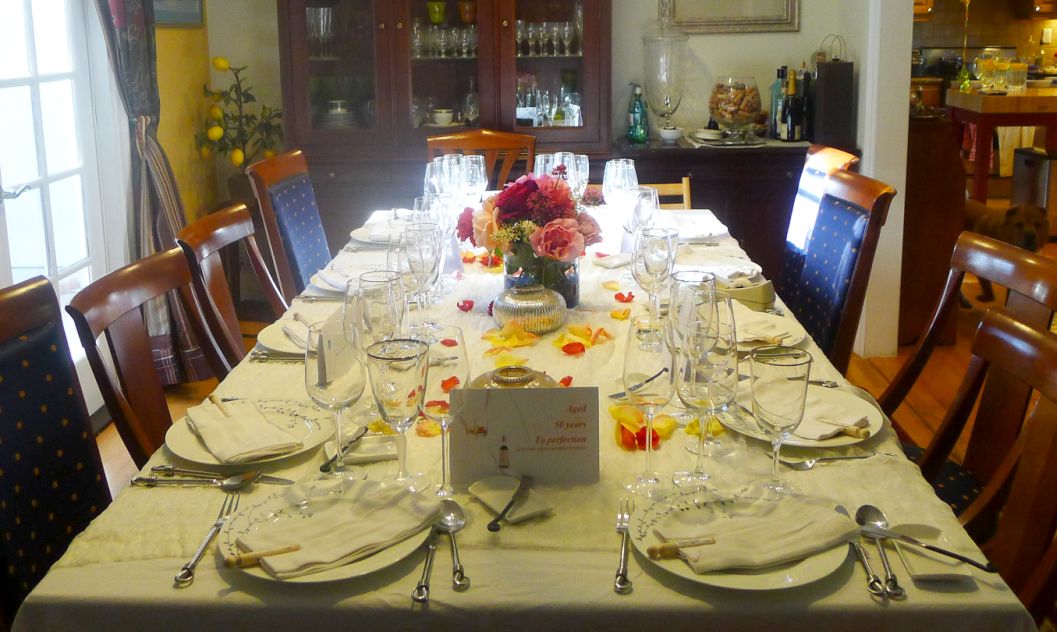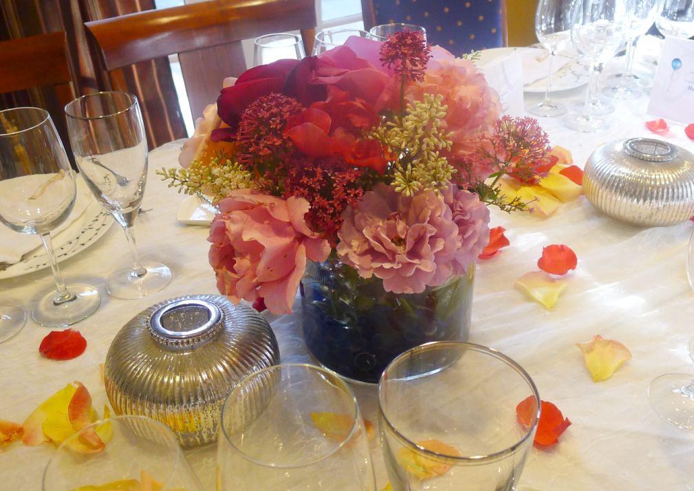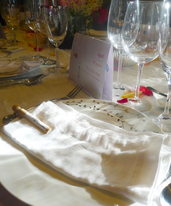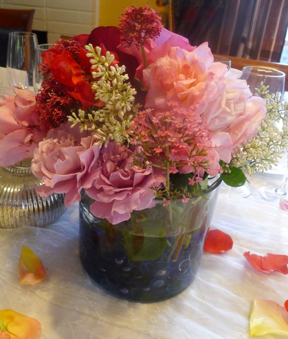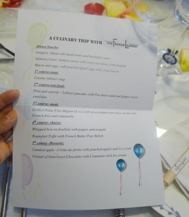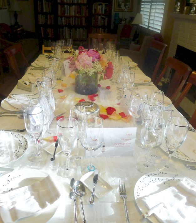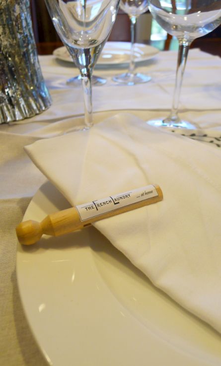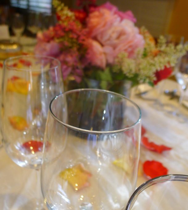 At the French Laundry the dinning table is classic elegance with white table cloth and white napkins so here I created the same feeling but I scattered rose petals for a pop of color.