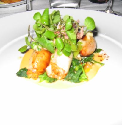 Stuffed Monterey Calamari with Lobster Panzanella (Panzanella is a refreshing Tuscan summer bread salad), Lobster sauce, Greens, Aioli |