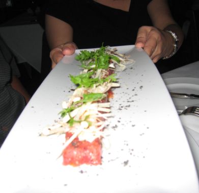 Ahi Tuna Tartare with toasted Sesame, Enoki Mushrooms, Scallions, Wasabi Tobiko (fish row). This dish is also very good, the Tuna is so tasty. We were debating if there was mayonnaise in this dish. |