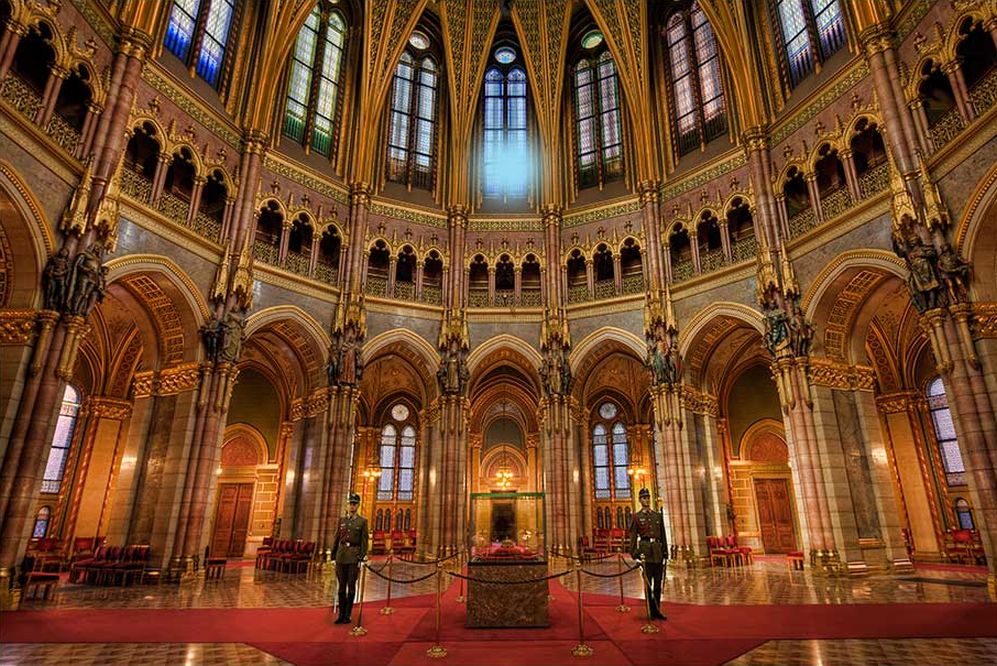 The Holy Crown of Hungary is in the center in a glass case and it is guarded 24/7.