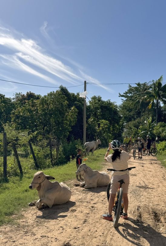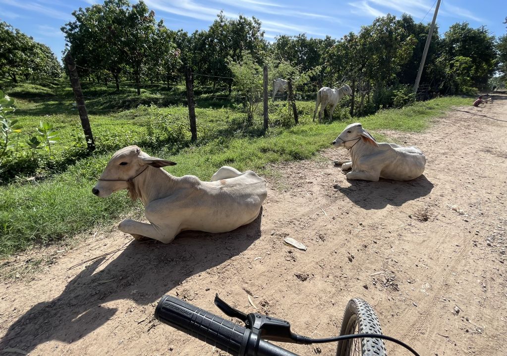 We biked through dirt road and encountered a bunch of cows laying on the ground.