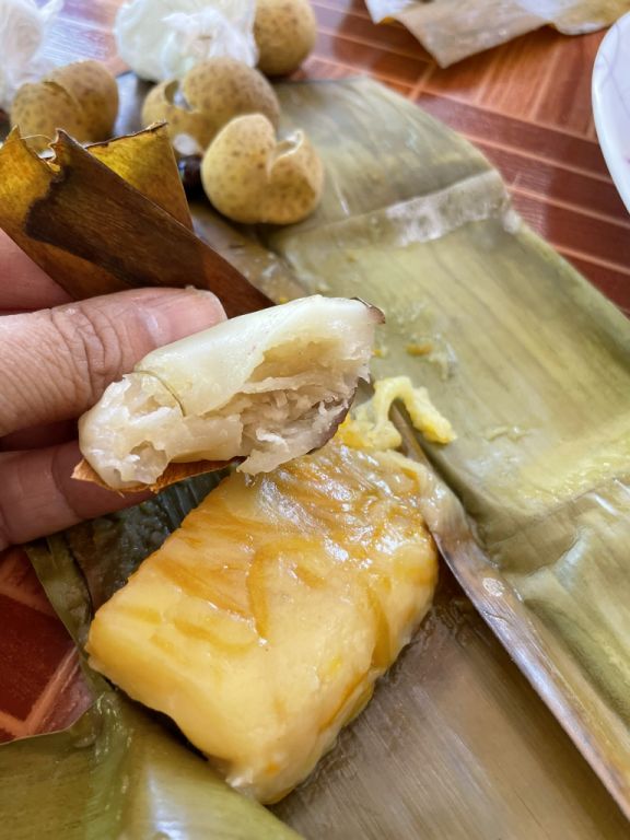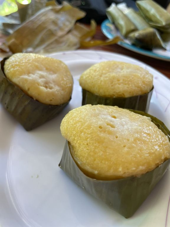 Banana cake with coconut wrapped in banana leaves. All the cakes are made in house.