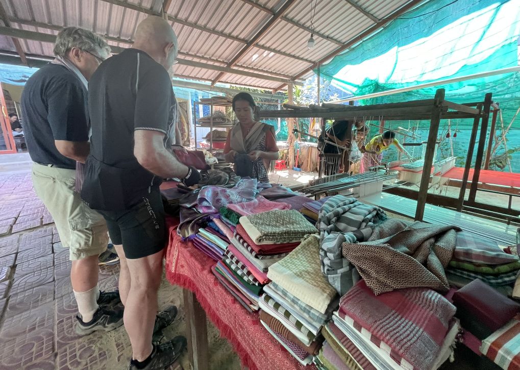 We are getting off our bike and headed to a local silk weaver shop.