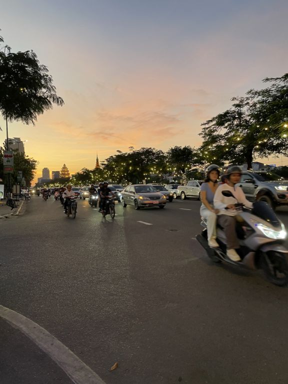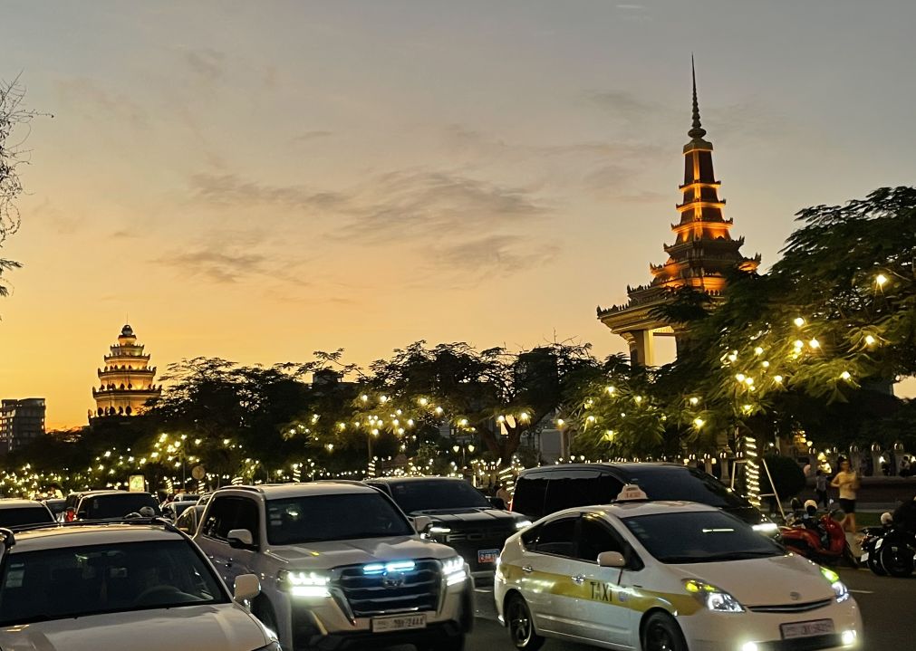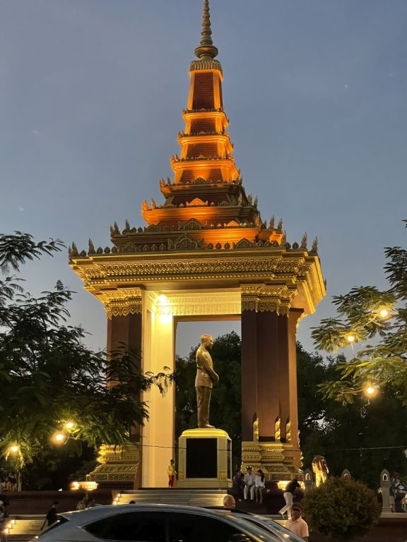 The sun was setting down on Sihanouk Boulevard. On the right is the statue of King Sihanouk. The statue is dedicated to Sihanouk's accomplishment on liberating the country on 9 November 1953 from the French colonialism.