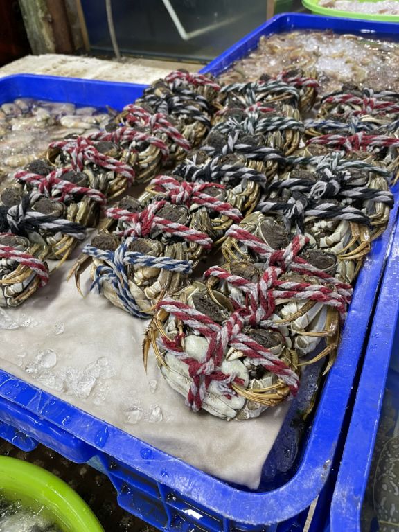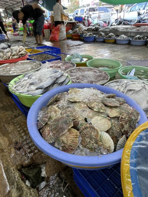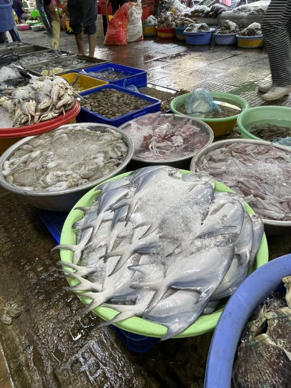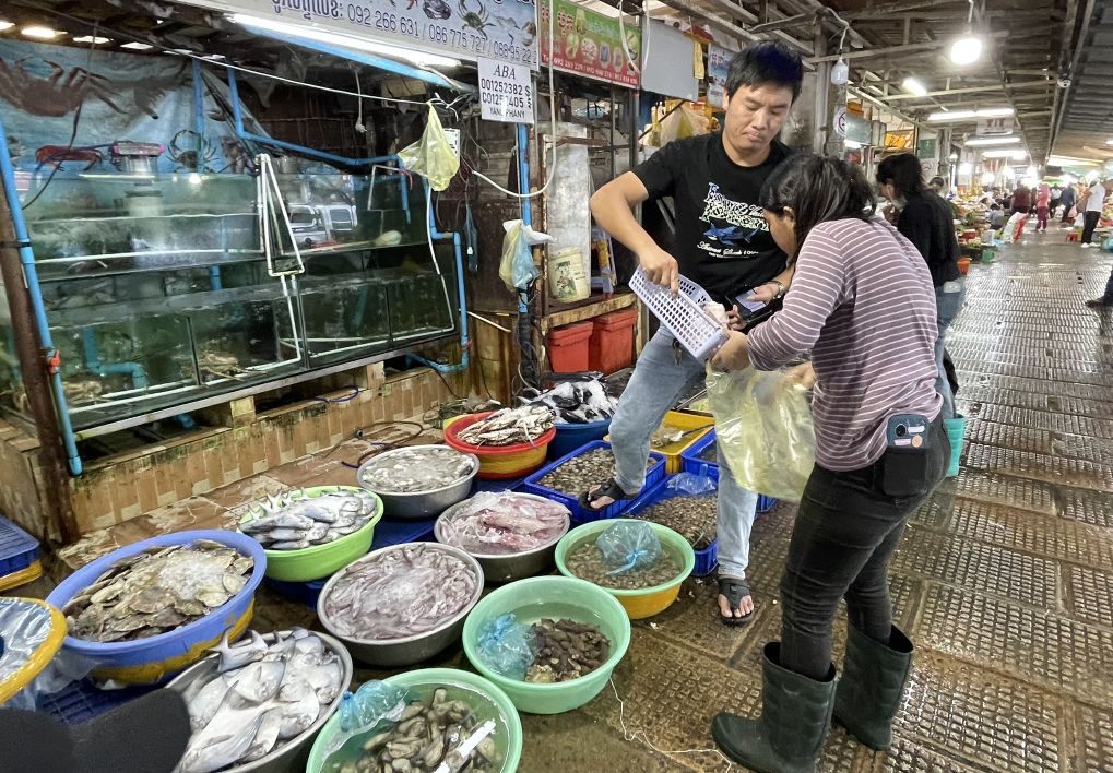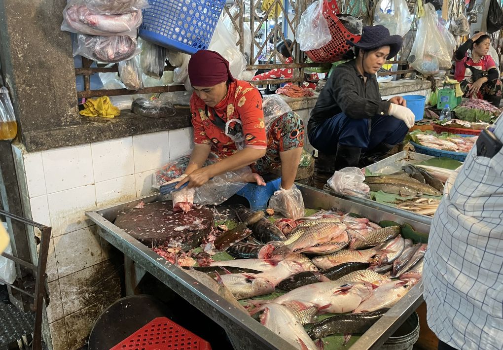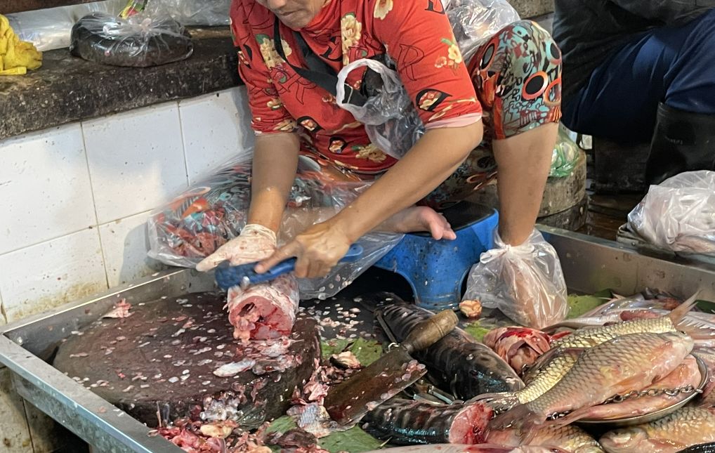 Notice that the salesperson is sitting on a stool with one feet on top and the other feet is wrapped in plastic so he can move his feet around and not be touching the fish. He has a cutting board and here you can see him scale the fish.