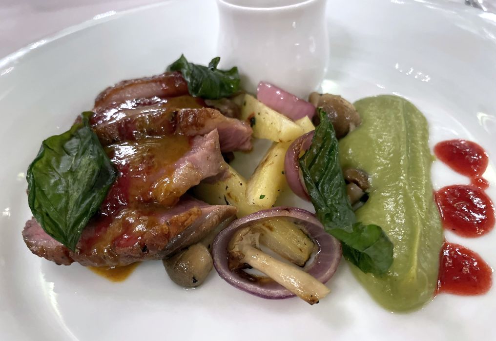 Roasted duck breast with assorted vegetable, avocado crema, and raspberry coulis.
