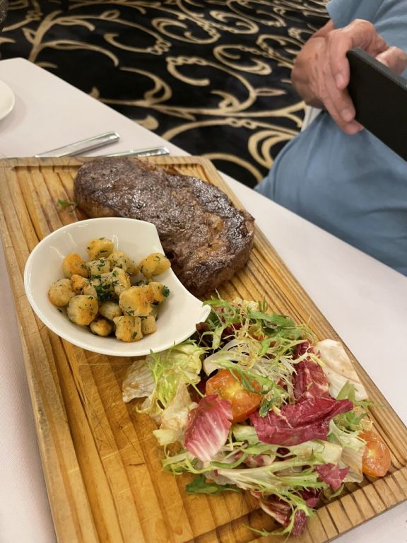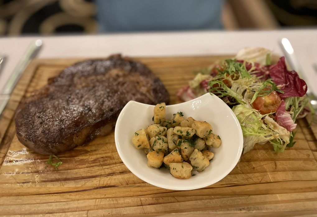 Hoa ordered a piece of steak with fried gnocchi and a mixed salad,