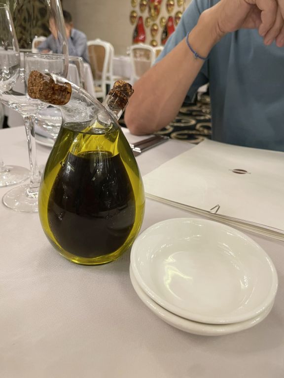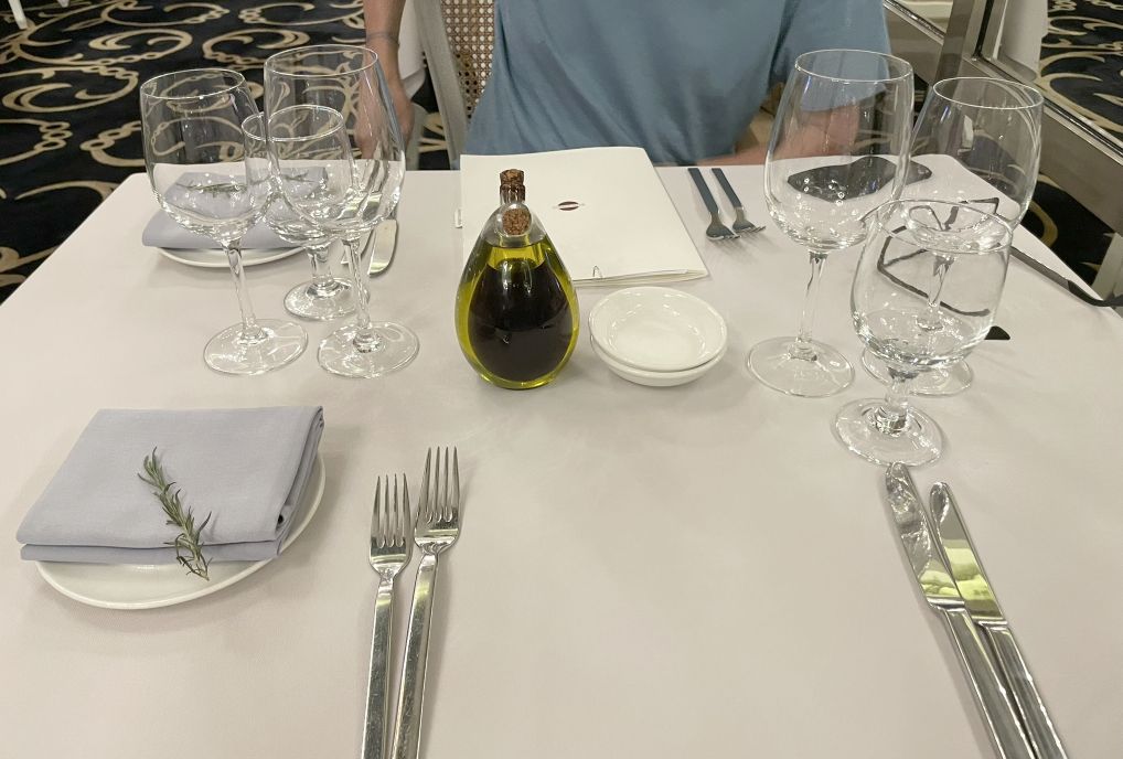 Place setting and a pretty bottle of oil and vinegar.