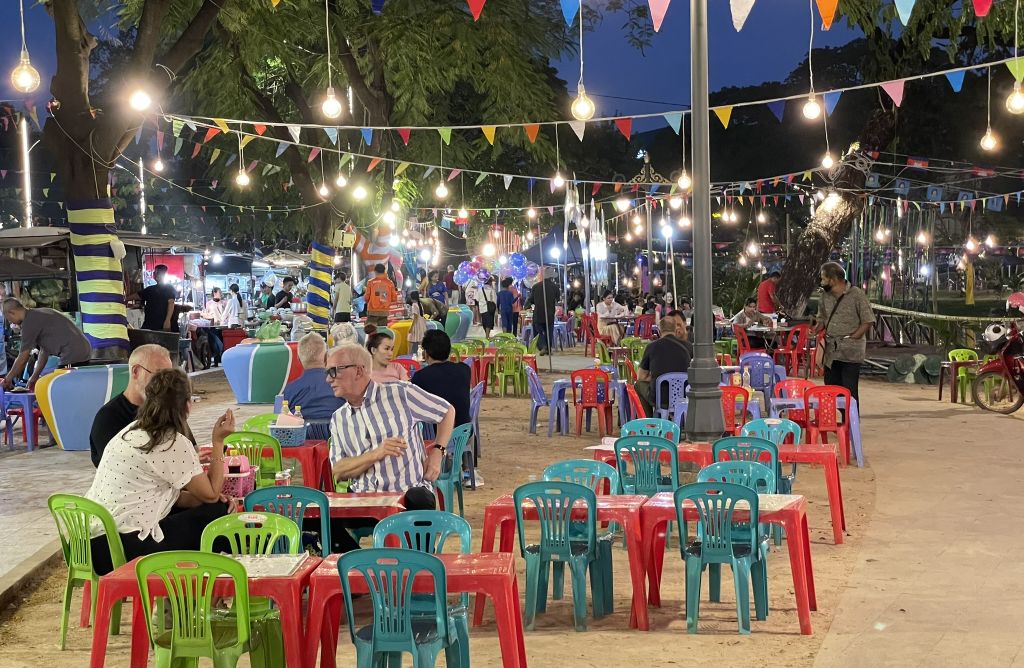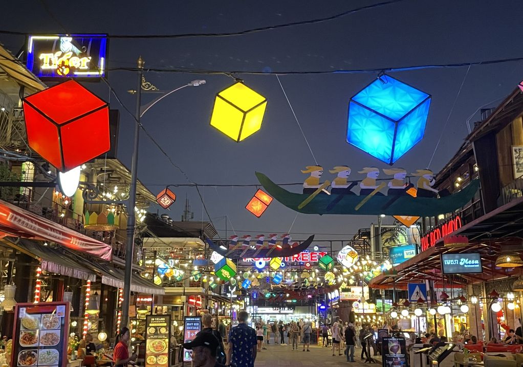 During the day it is a regular road but at night time the road is blocked off to traffic and becomes a pedestrian street which is very safe to take a stroll.