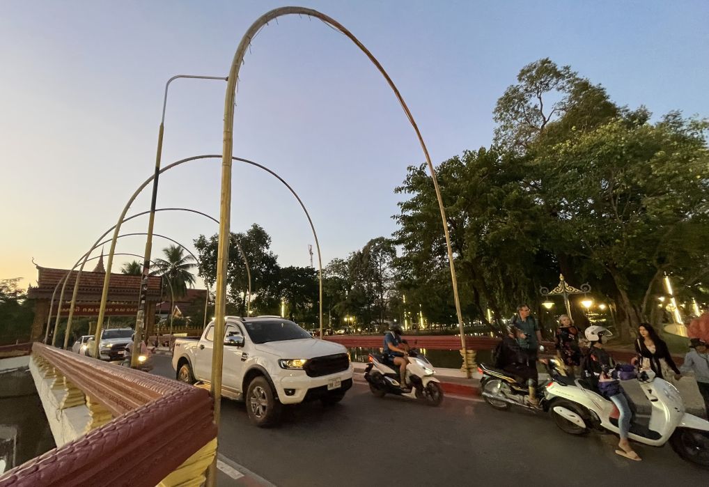 In the early afternoon part of Road 60 starts to fill with vendors pushing their carts and unfolding stands and they set up plastic tables and chairs along the river.