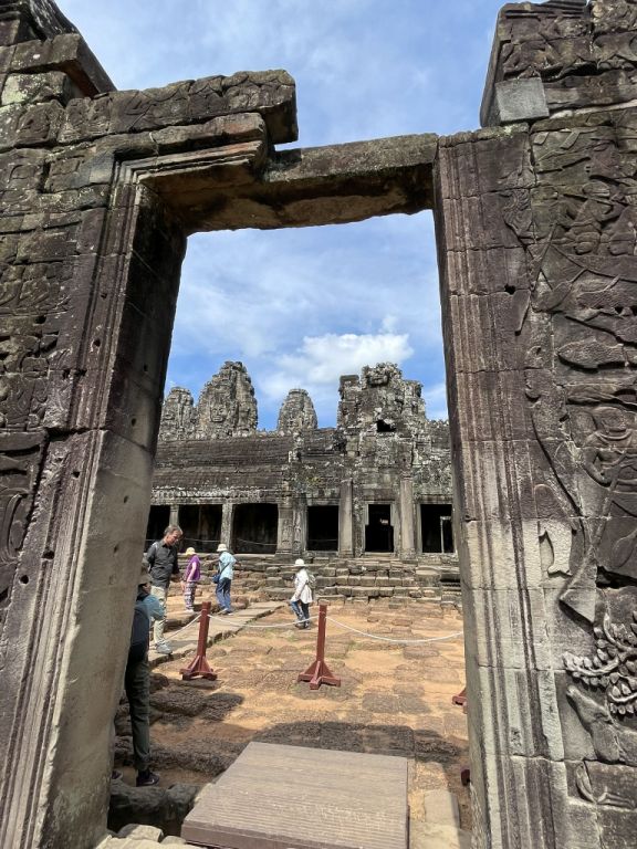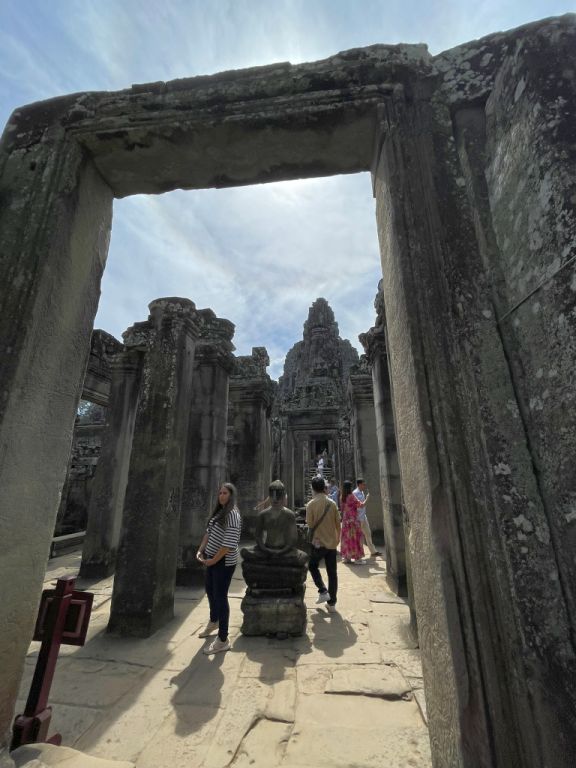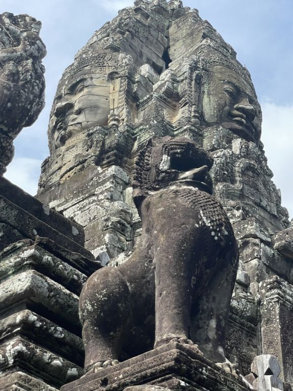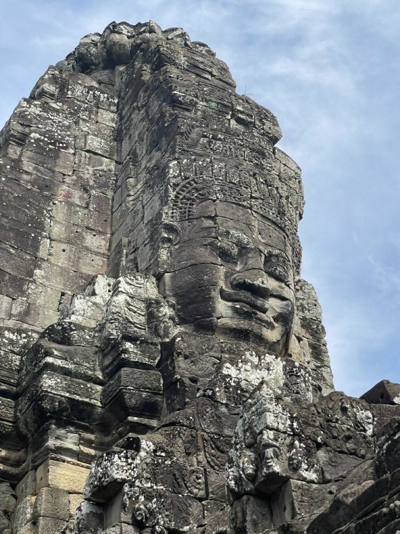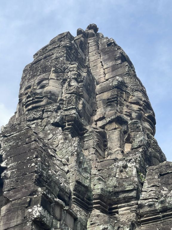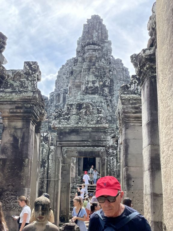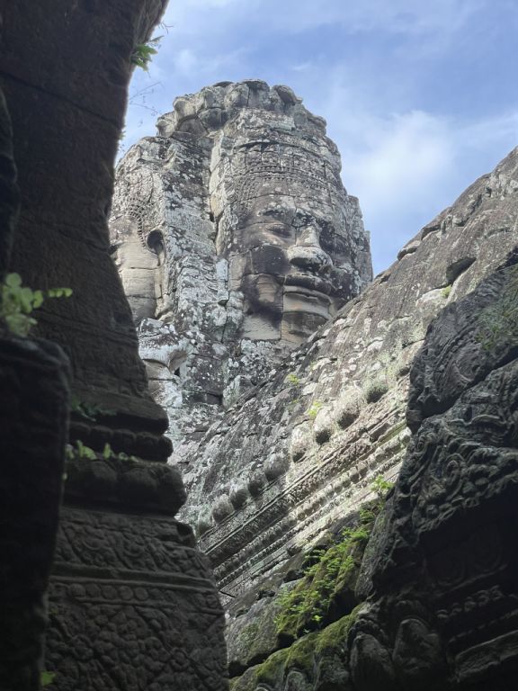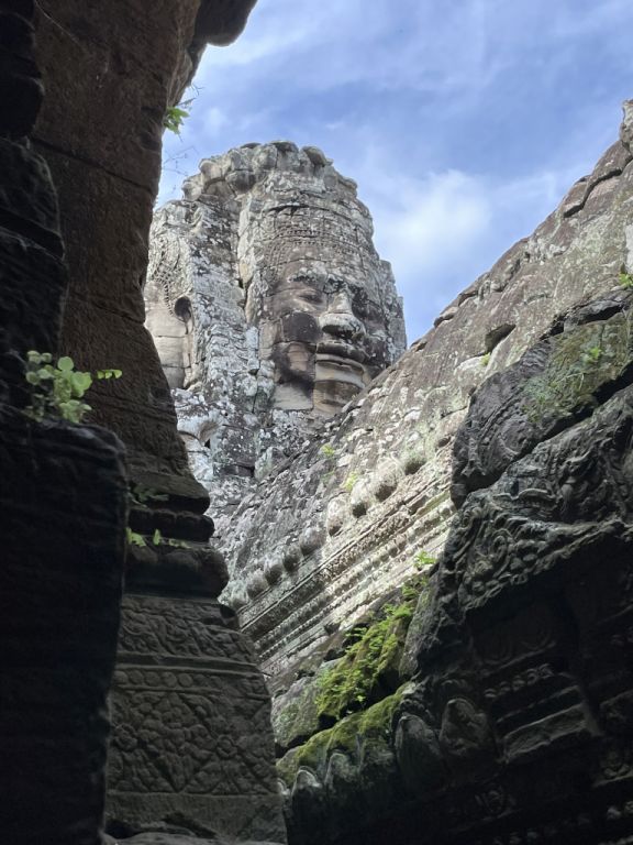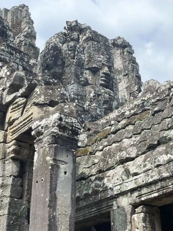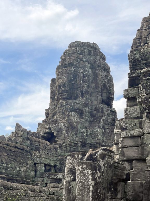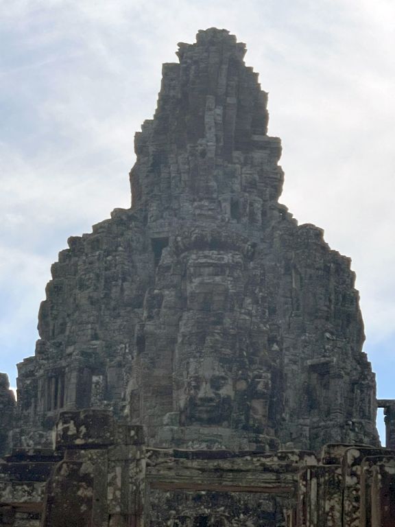 Entering one of the many courtyard in the temple. Above is a smiling face tower looking down at visitors.