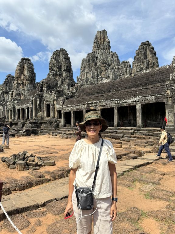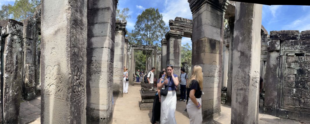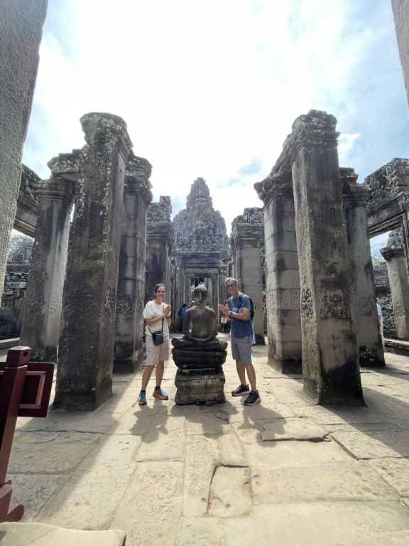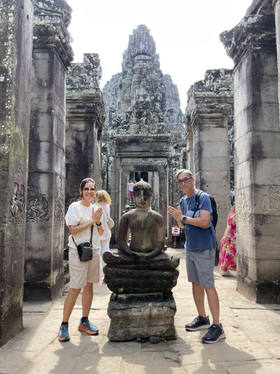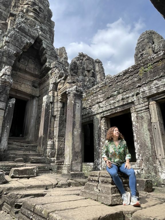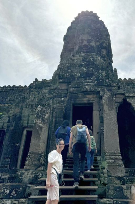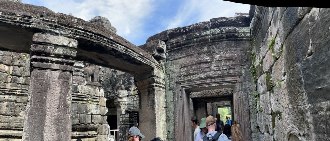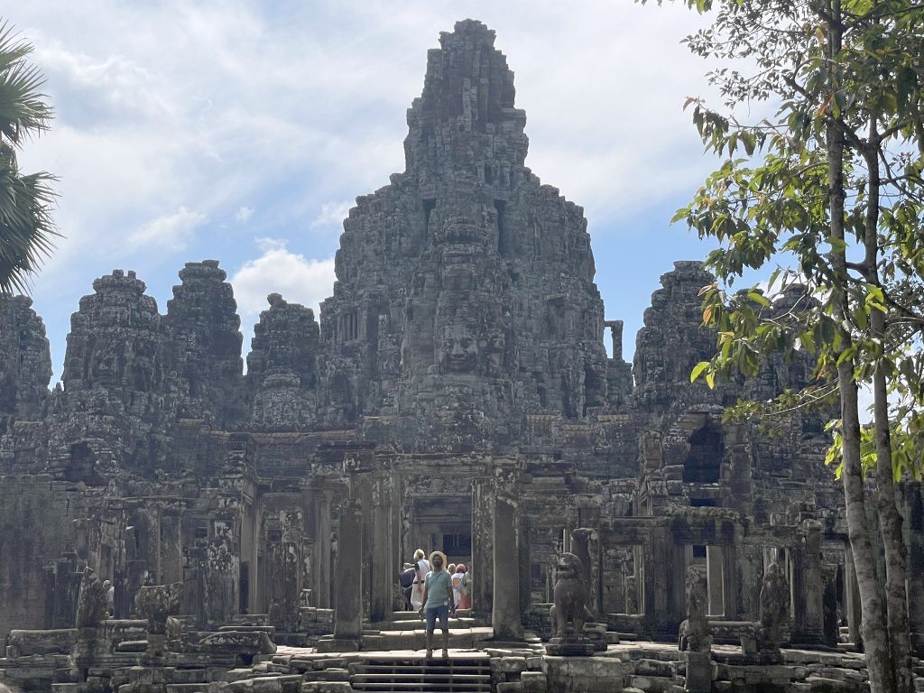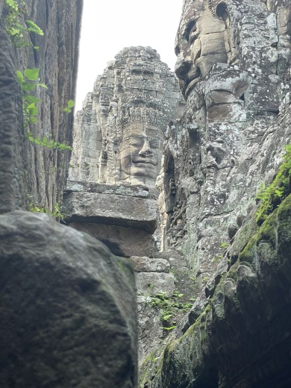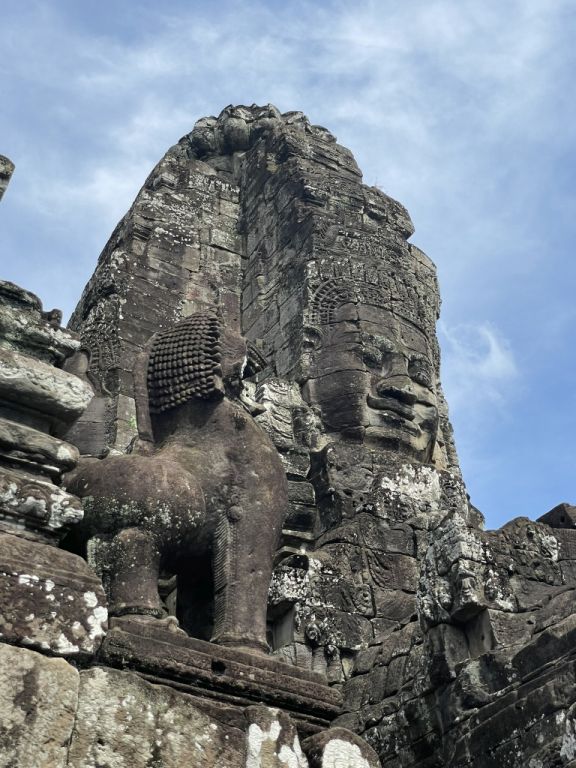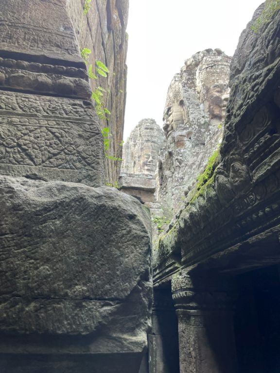 Entering one of the many courtyard in the temple. Above is a smiling face tower looking down at visitors.