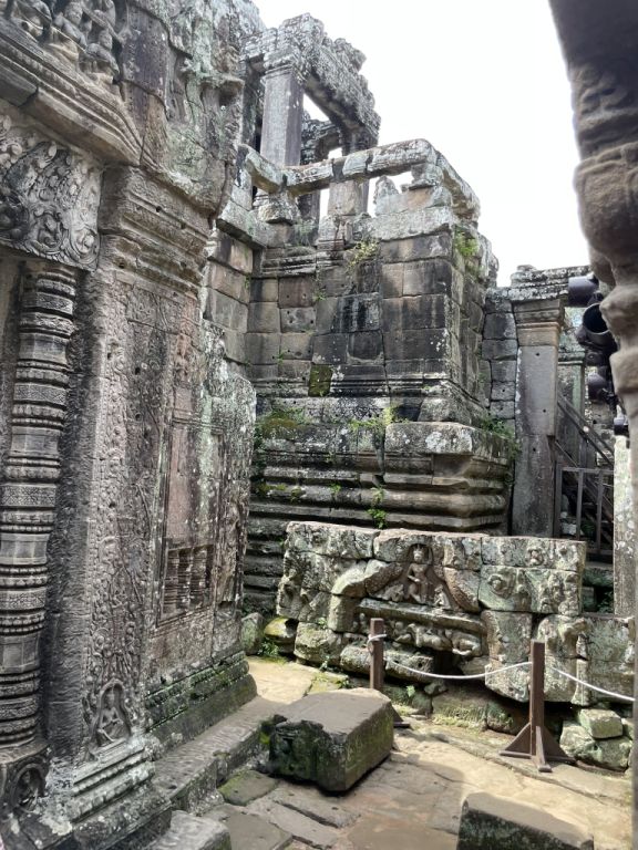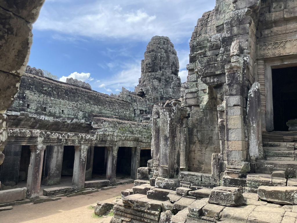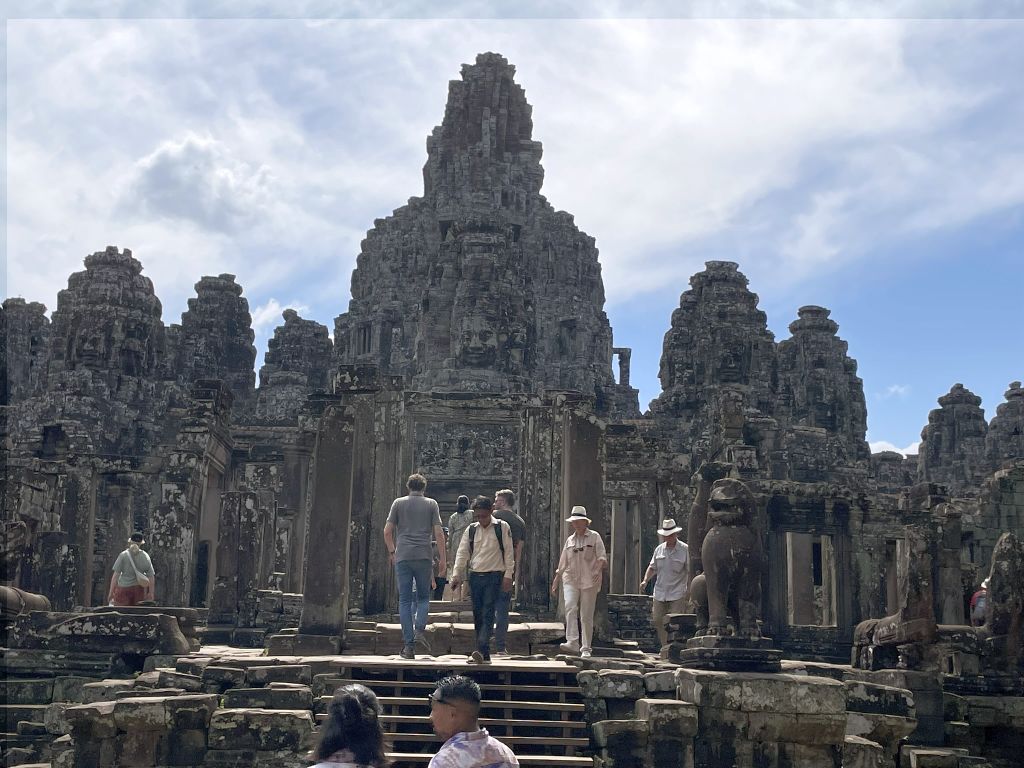 We are now in the central square with the four-sided central tower some of which seem to represent Jayavarman in the guise of Avalokiteś-vara, the great bodhisattva. Each side of the tower is oriented to a cardinal direction. The central tower is surrounded by an additional 12 towers.