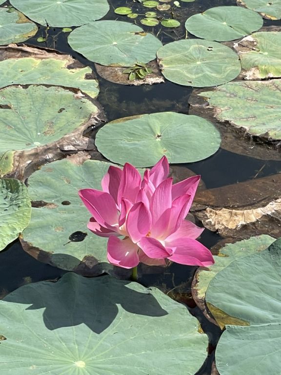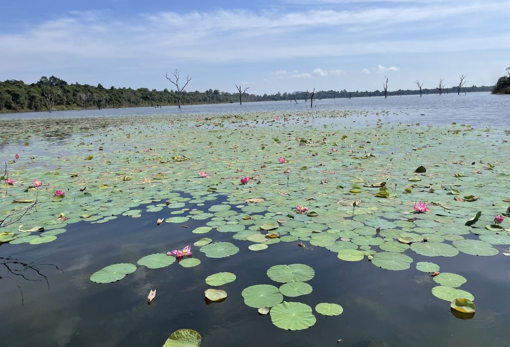 of the reservoir, beautiful pink lotuses greet visitors on either side of the
