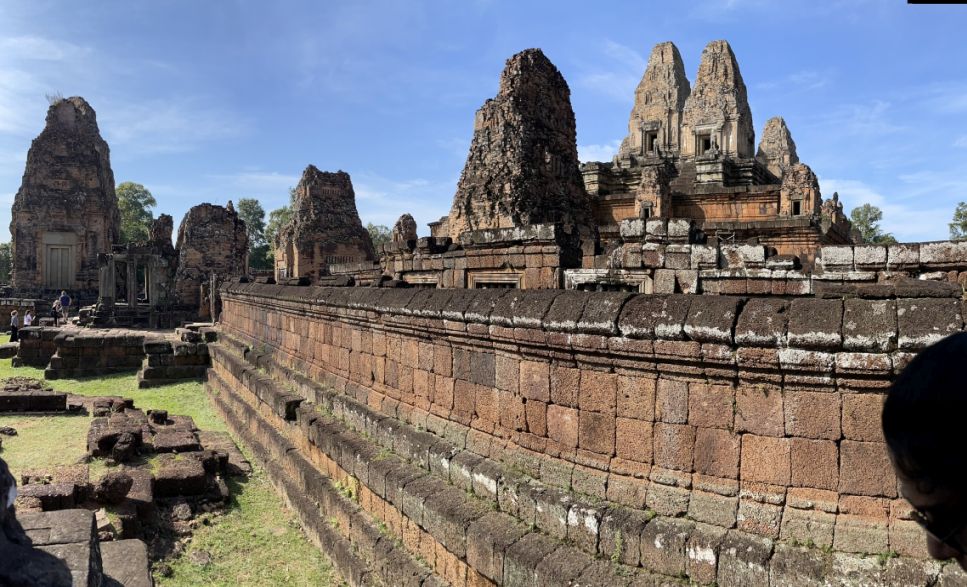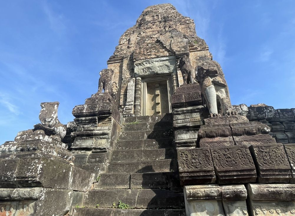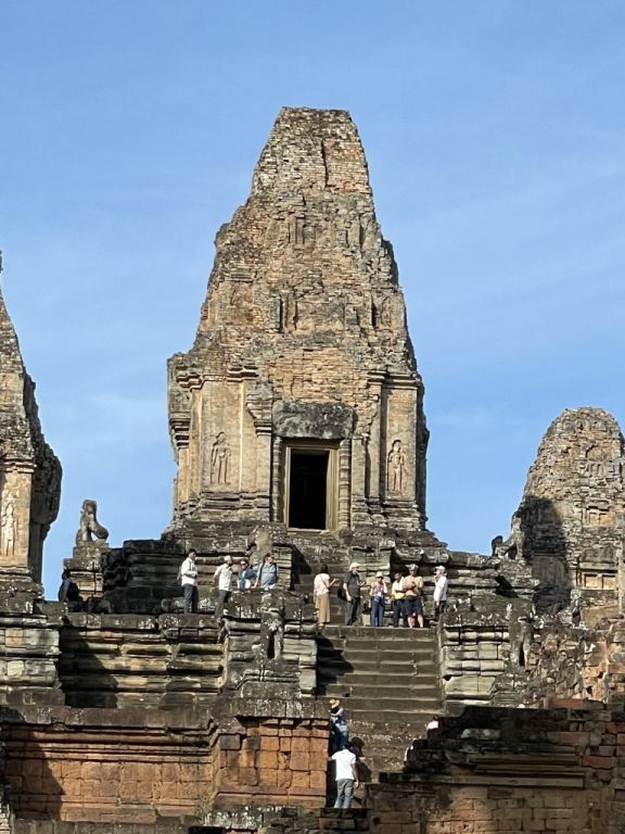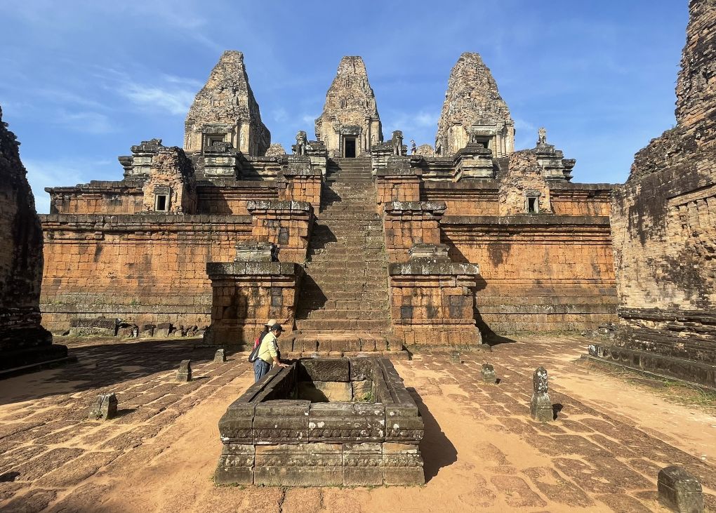 Pre Rup temple is a grand brick temple with an arrangement of 6 towers rising from a pyramid base to form the “temple mountain” of combined bricks, laterite and sandstone with an architectural concept of the ancient Khmer to represent the sacred Mount Meru in Hindu beliefs.