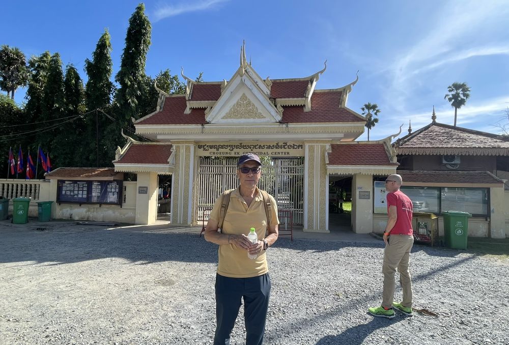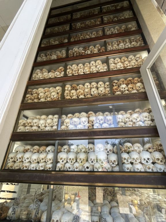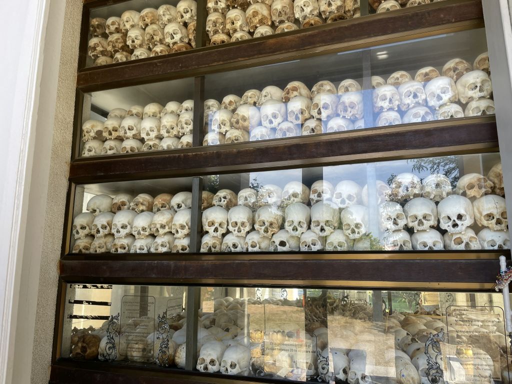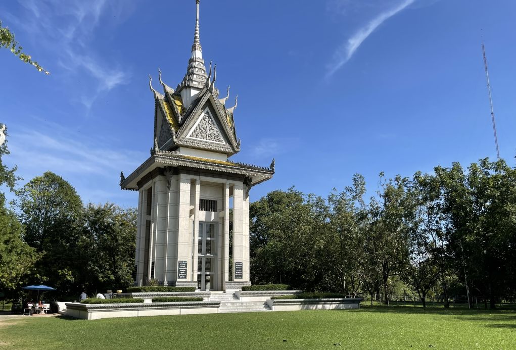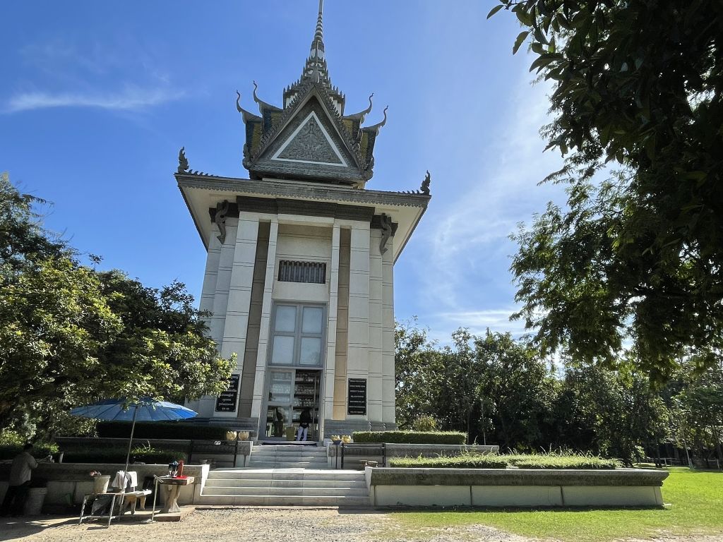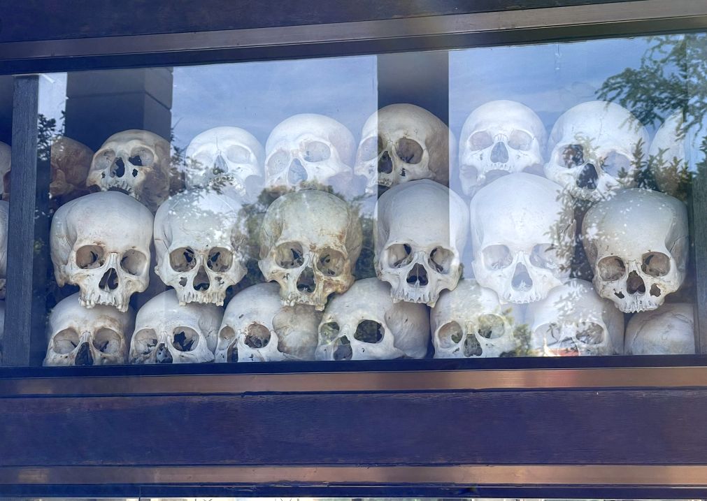 In the center of the site stands a 17-tiered Buddhist stupa that displays more than 8,000 skulls exhumed from the graves.