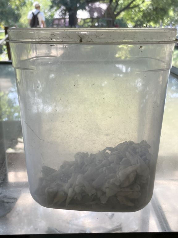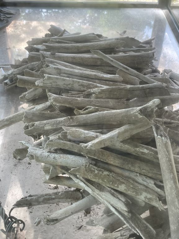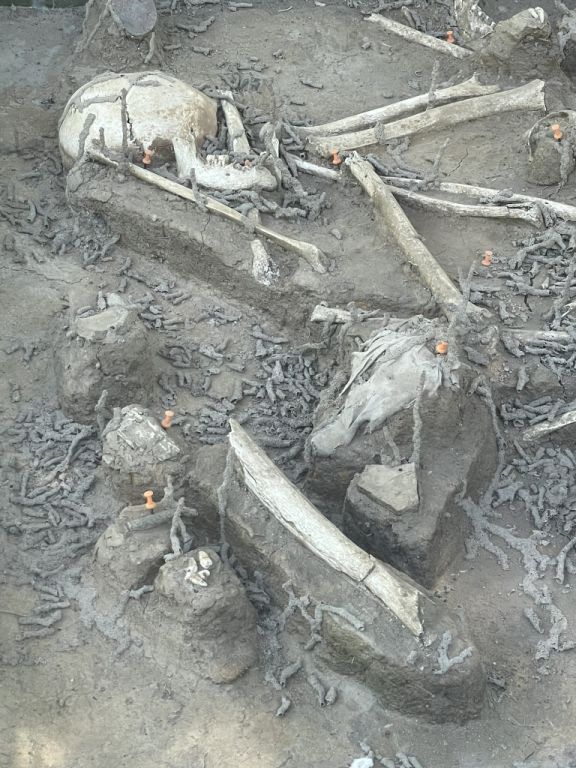 Pieces of bones remaining after excavation in 1980 on display in a glass box