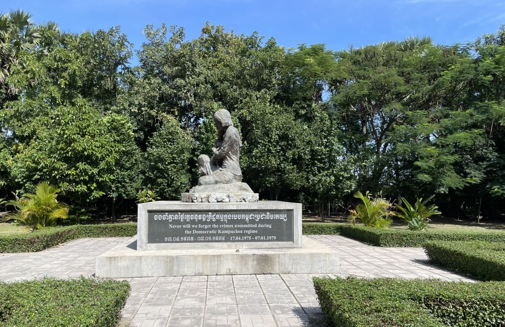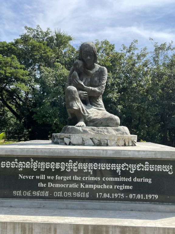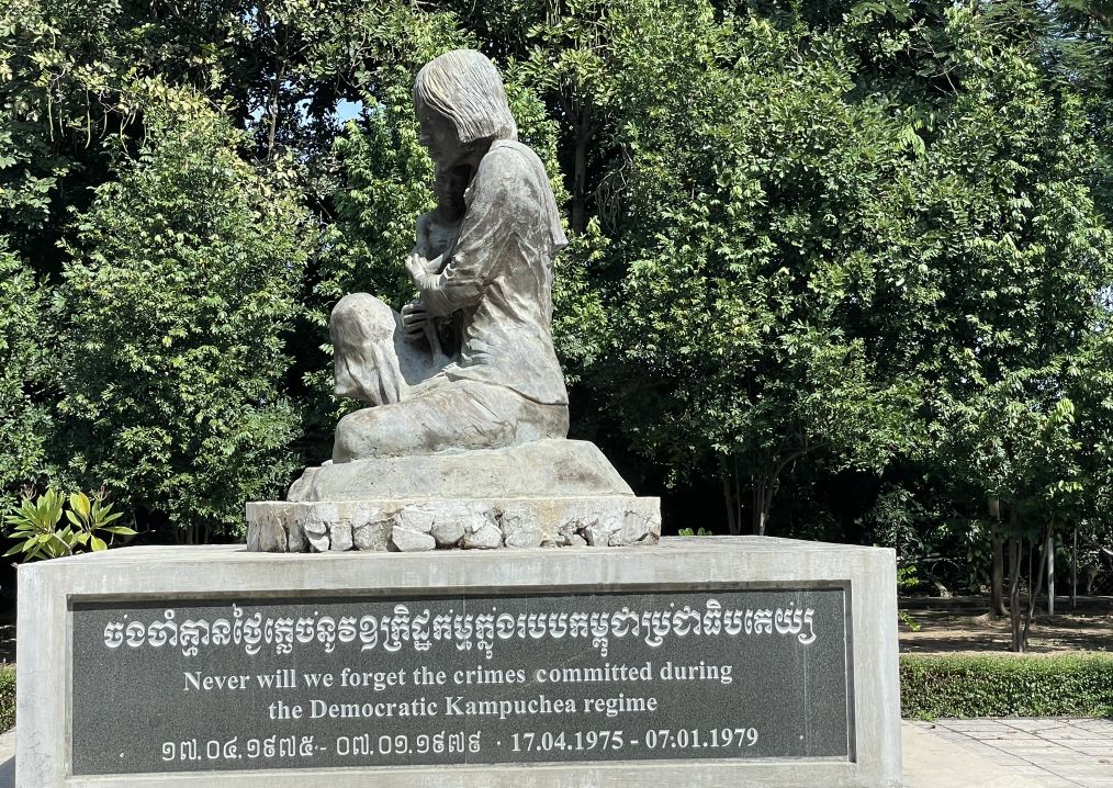 Under the statue is a plaque to remind never to forget the atrocities committed by the Khmer Rouge.