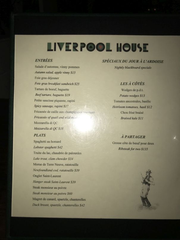 Liverpool house is the sister restaurant of the famous Joe Beef restaurant (we could not get a reservation there), one of Montreal well known restaurant. Since we could not get in Joe Beef we settled on Liverpool house which is located next to Joe Beef.