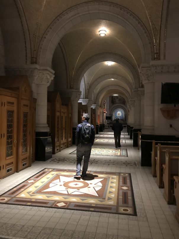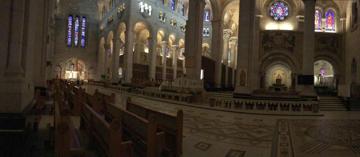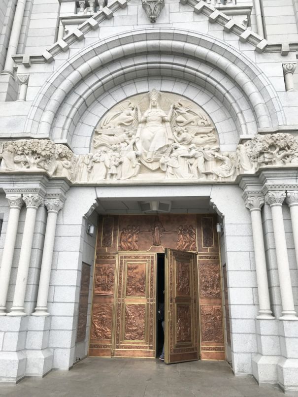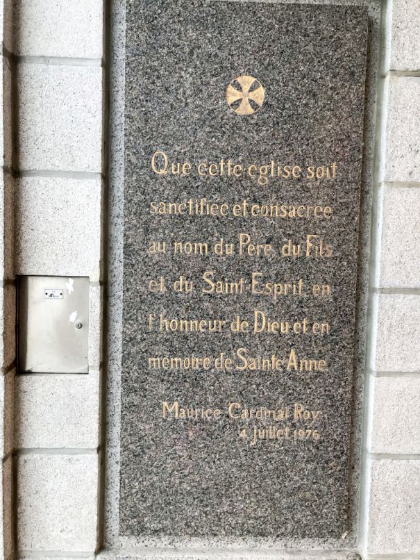At the peak, between the two bell towers, you can find the statue of Saint Anne (gold) which was saved from the destructive fire of the first Basilica in 1922.