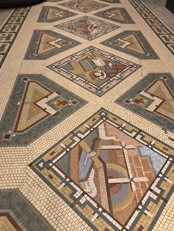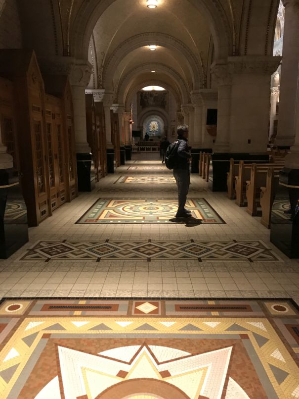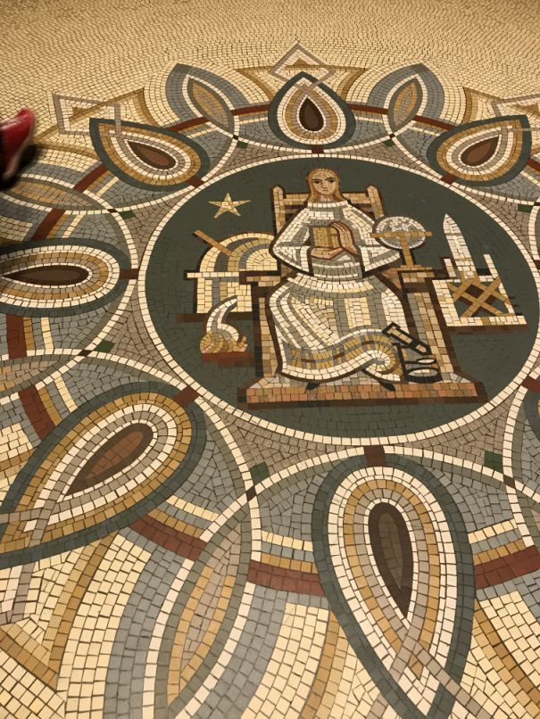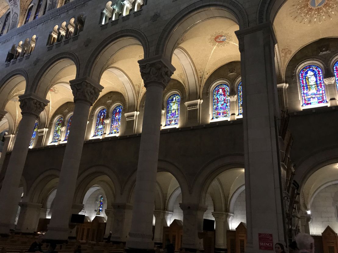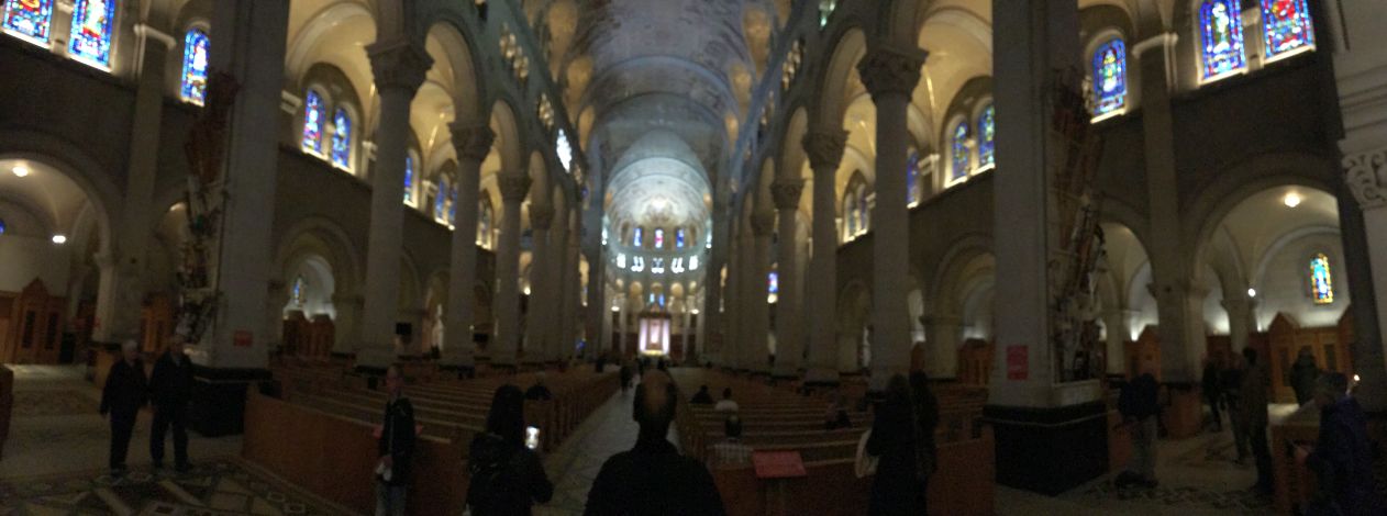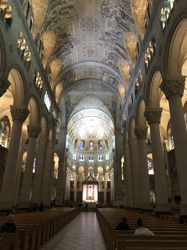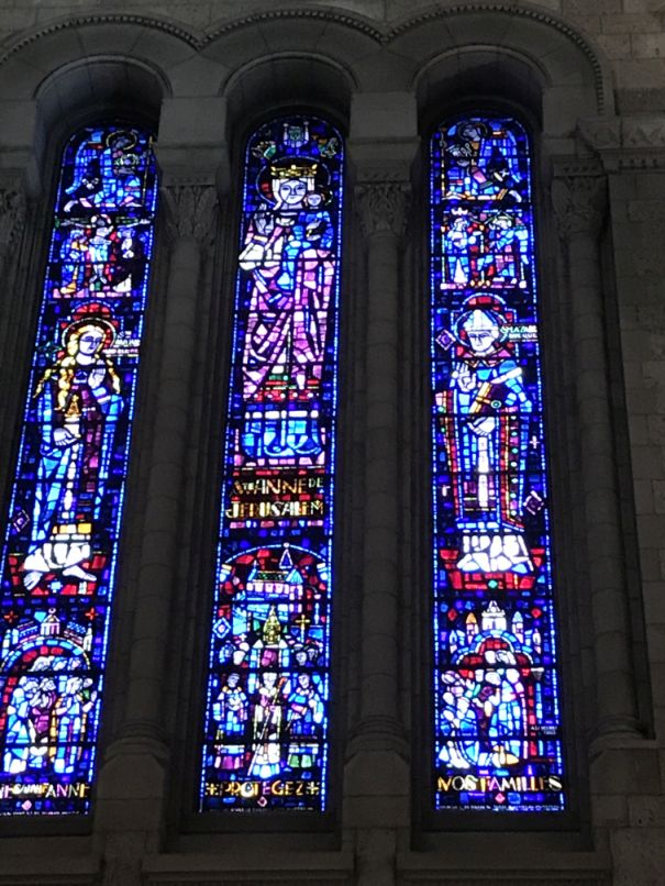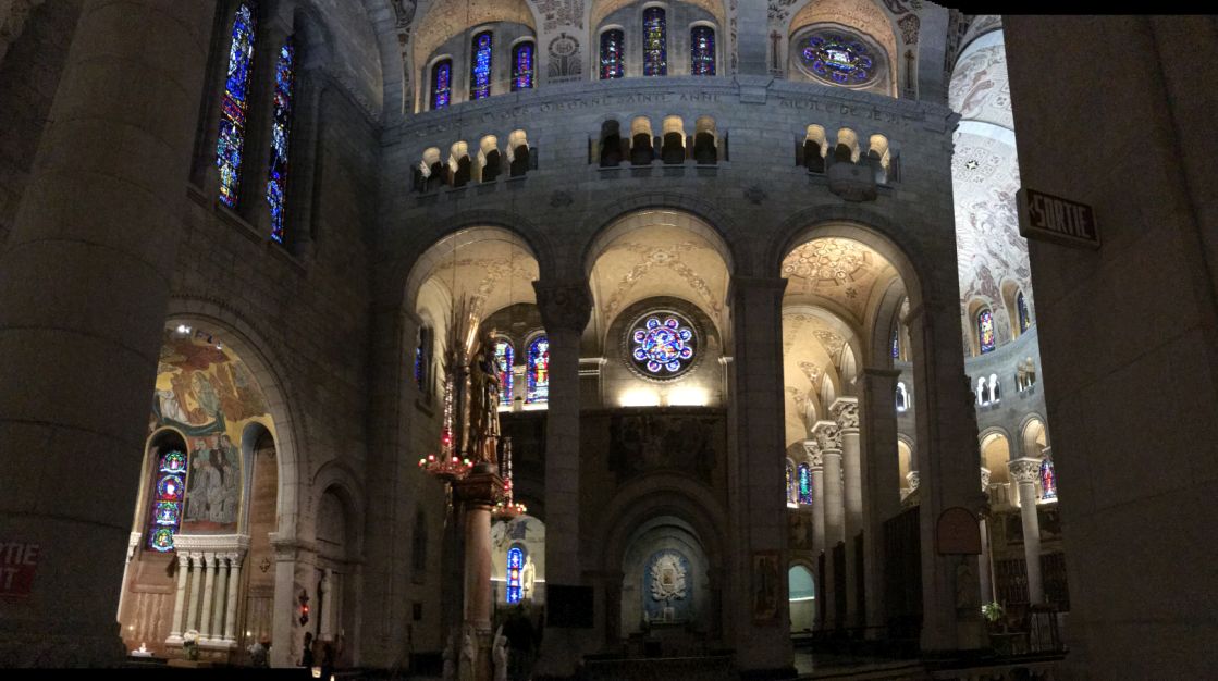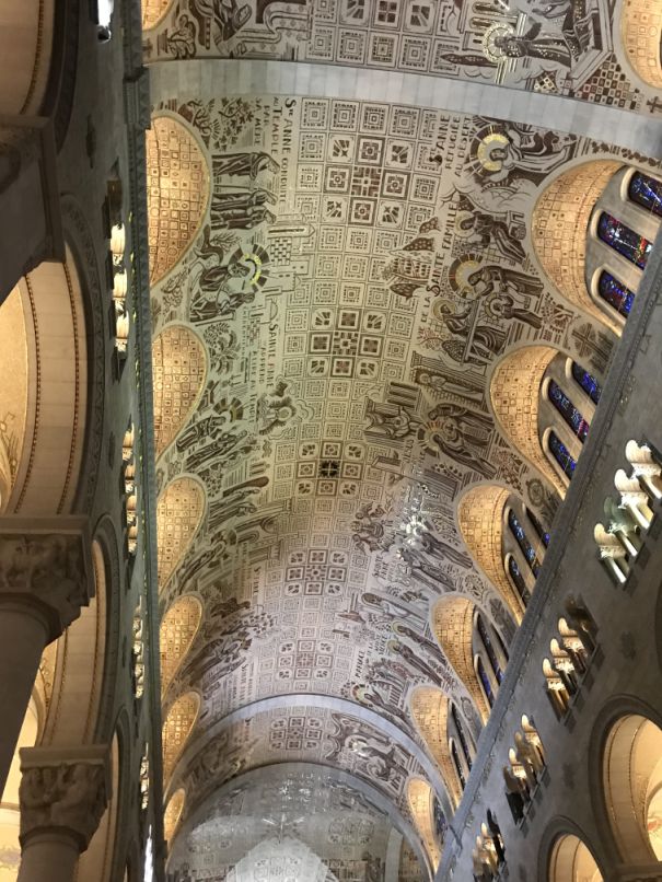 Over 240 stained glass windows and mosaics telling the life story of Saint Anne, covering the ceiling and sides of the church.