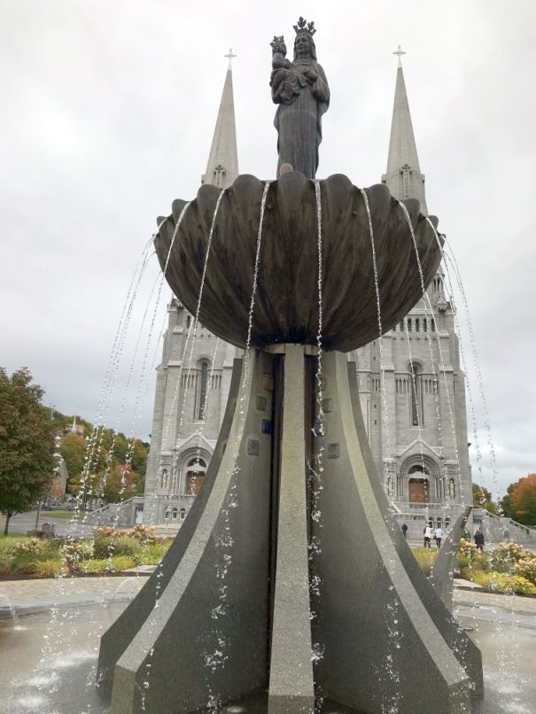 Installed in 2008 for the celebration of the 350th anniversary of the Shrine, this fountain reaches a height of 33 foot. Water flows over the scalloped border of a bronze basin of some 13 foot in diameter. At the summit is a statue representing Saint Anne and her daughter Mary.
