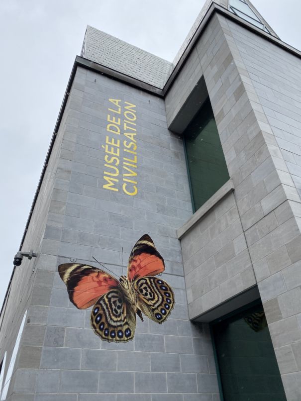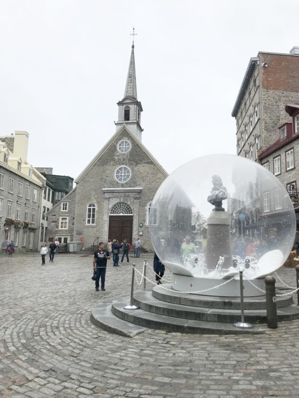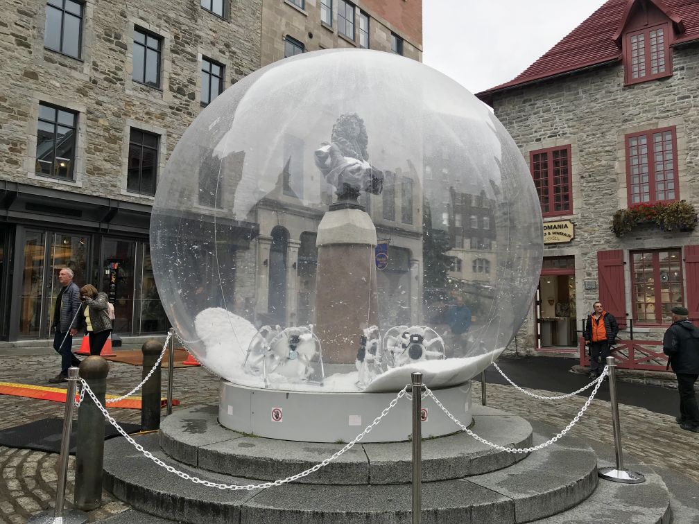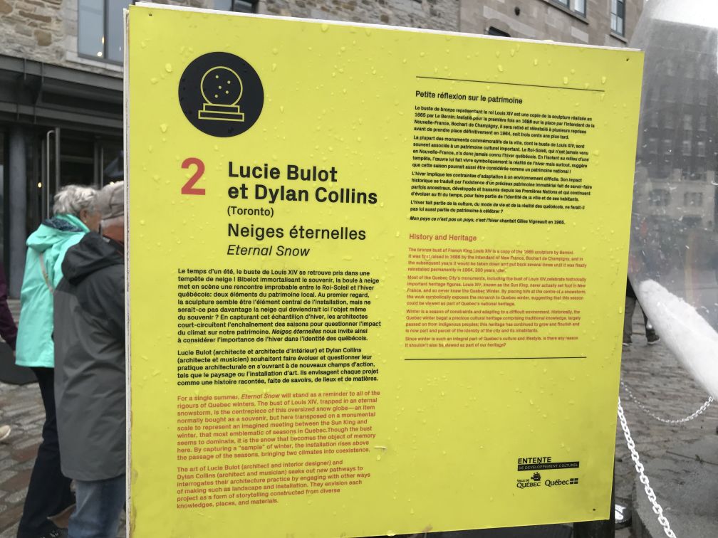 The sign said: for a single summer, Eternal Snow will stand as a reminder to all of the rigorous of Quebec winters. The bust of Louis XIV, trapped in an eternal snowstorm is the centerpiece of the this oversized snow globe, and item normally bought as a s souvenir, but here transposed in a monumental scale to represent an imagined meeting between the Sun King and the winter, that most emblematic of season in Quebec. Thought the bust seems to dominate, it is the snow that becomes the object of memory here. By capturing a "sample" of winter, the installation rises above the passage of the seasons, bringing two climates into coexistence.