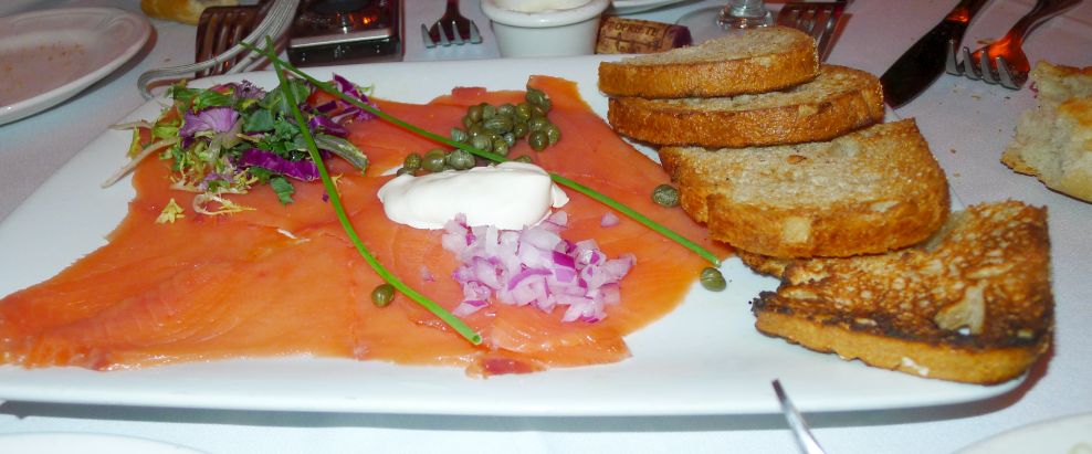 Smoked salmon, brioche, Crème fraîche, red onion, capers.