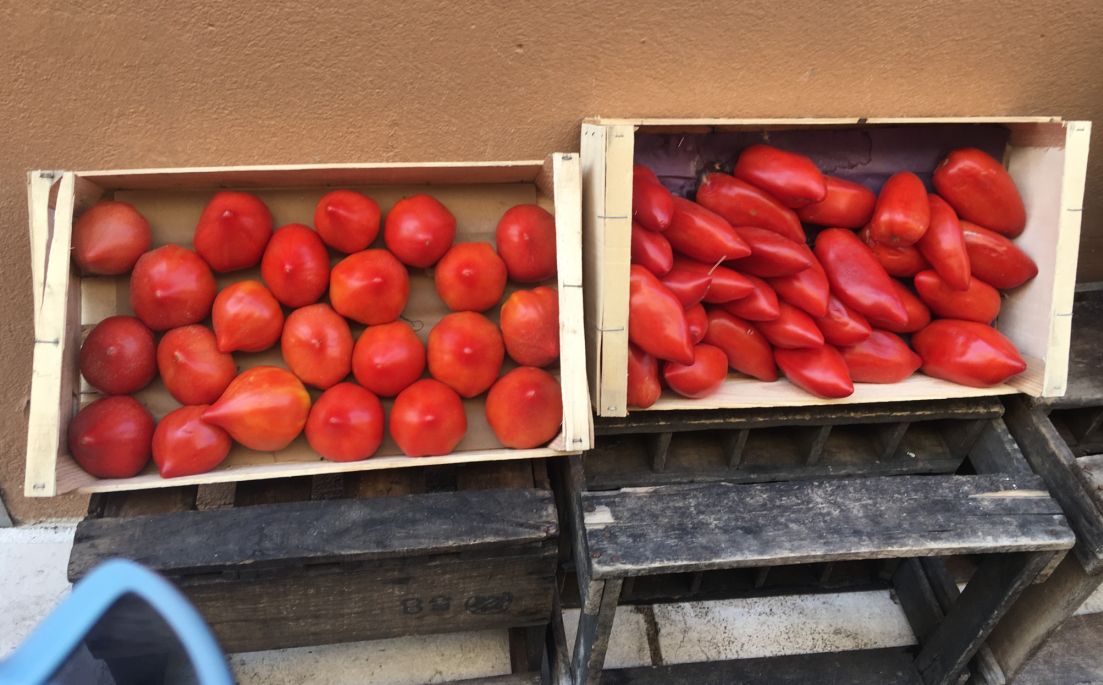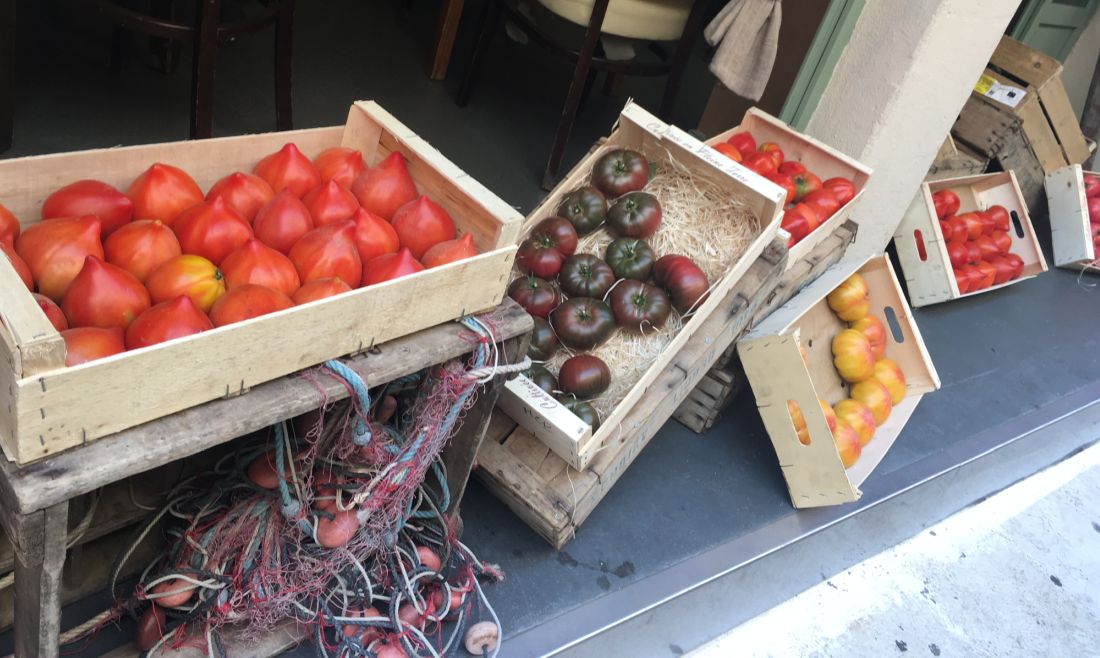 Ripe tomatoes on display right and for sale on the outside of the restaurant.